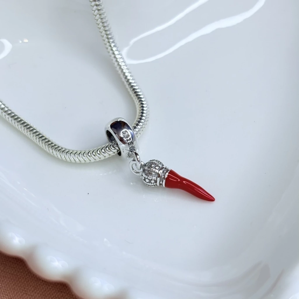O berloque de pimenta vermelha com base em prata 925 é uma peça charmosa e cheia de significado, associada a proteção e boa sorte. A pimenta é confeccionada em acrílico brilhante, com acabamento liso que realça sua cor intensa e vibrante.