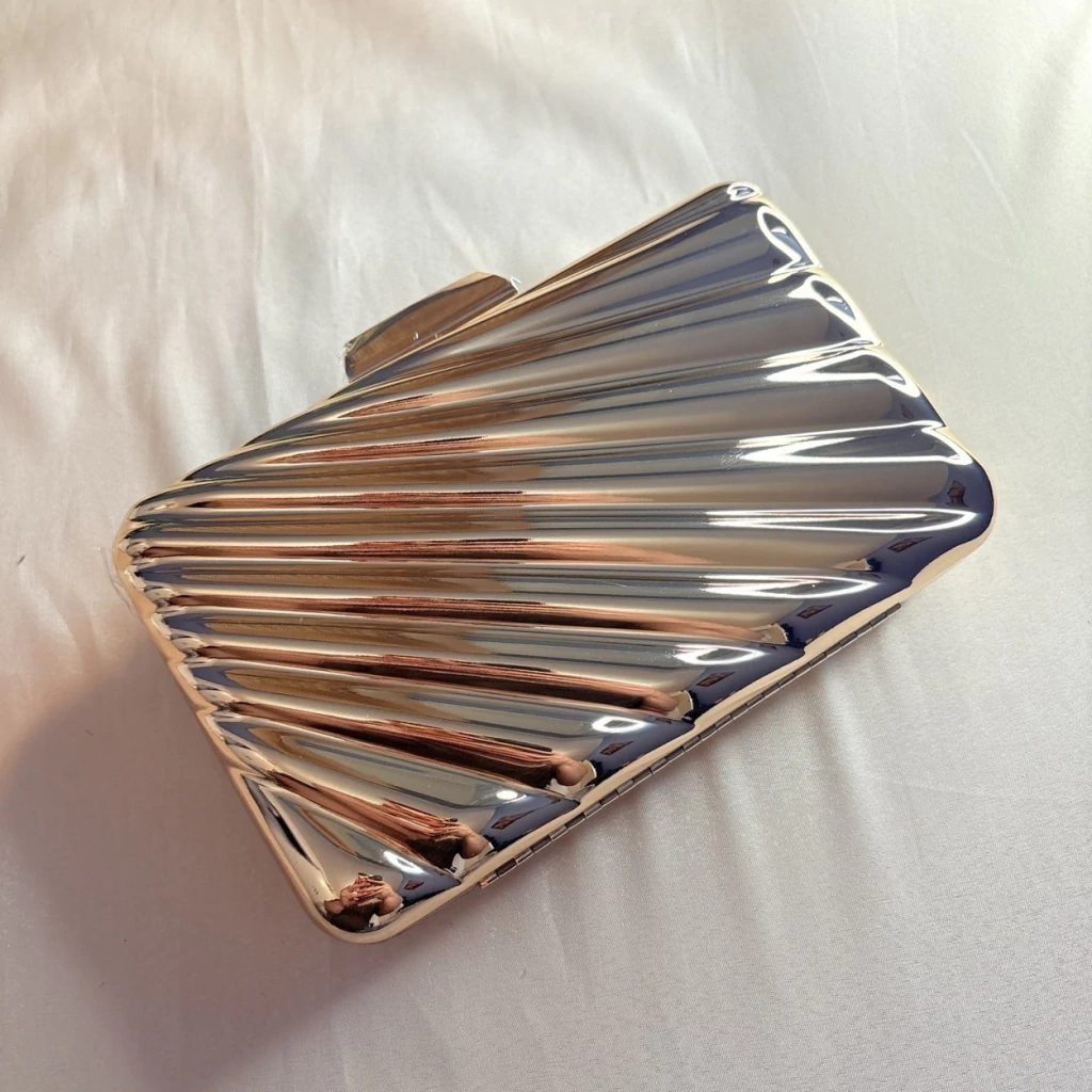 A bolsa de festa dourado em metal com frisos é puro glamour em forma de acessório. Sua superfície brilhante e detalhes de frisos nas laterais refletem a luz com sofisticação, sendo perfeita para eventos especiais como casamentos, festas noturnas ou jantares elegantes.