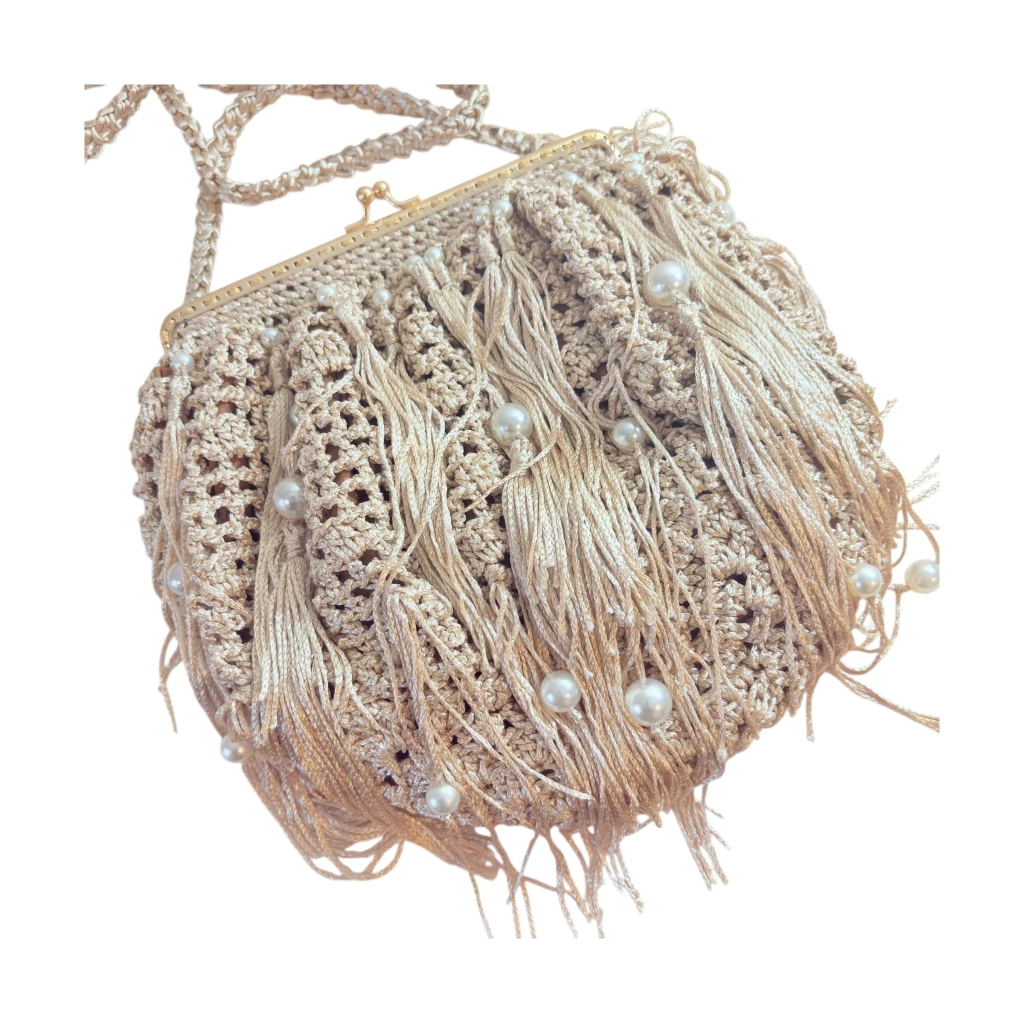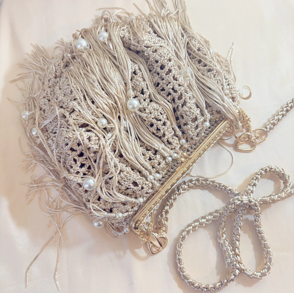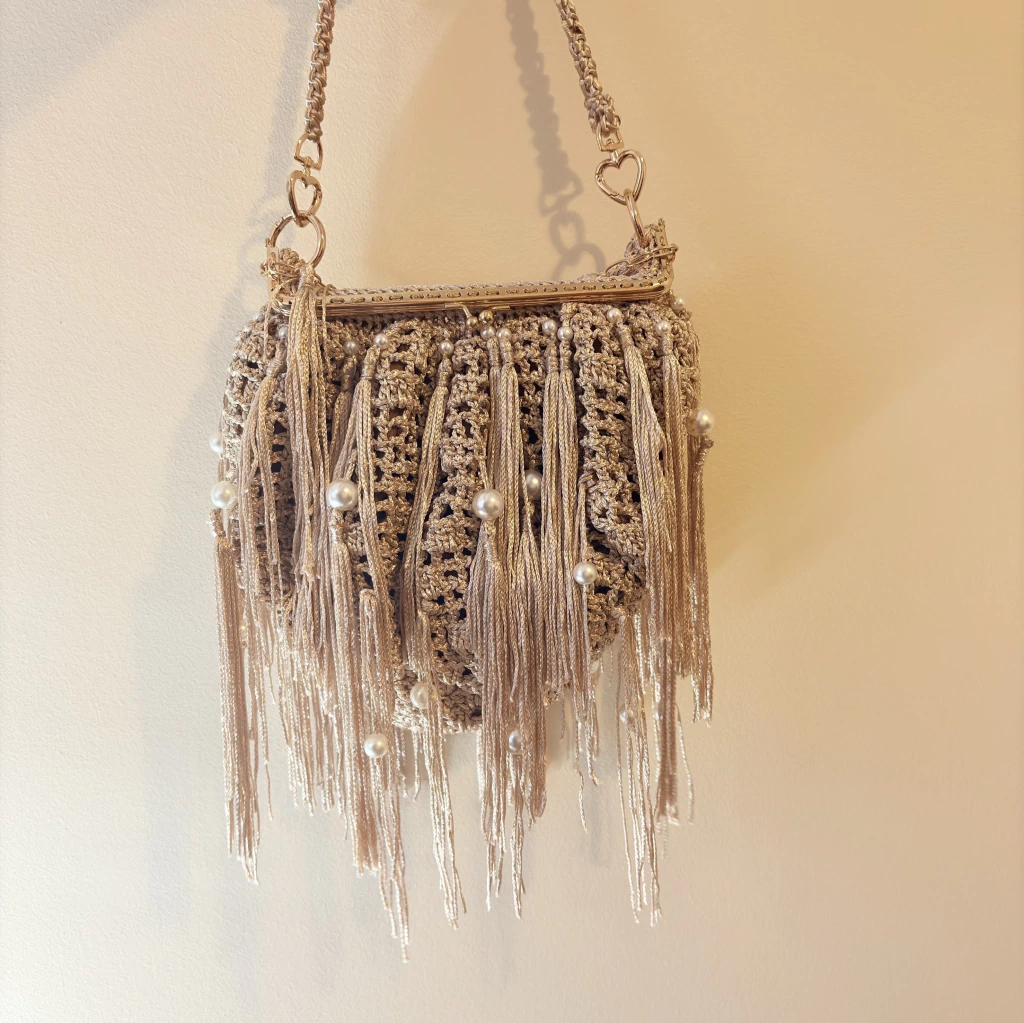 A bolsa de festa champagne em crochê com franjas e pérolas é uma verdadeira joia do artesanato brasileiro. Feita totalmente à mão, cada detalhe dessa peça carrega delicadeza, textura e elegância, tornando-a perfeita para quem busca um acessório exclusivo para casamentos, formaturas e eventos sociais — seja durante o dia ou à noite.