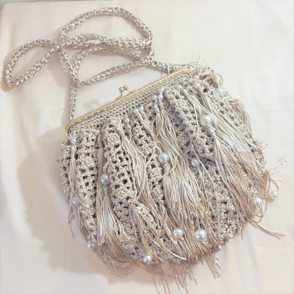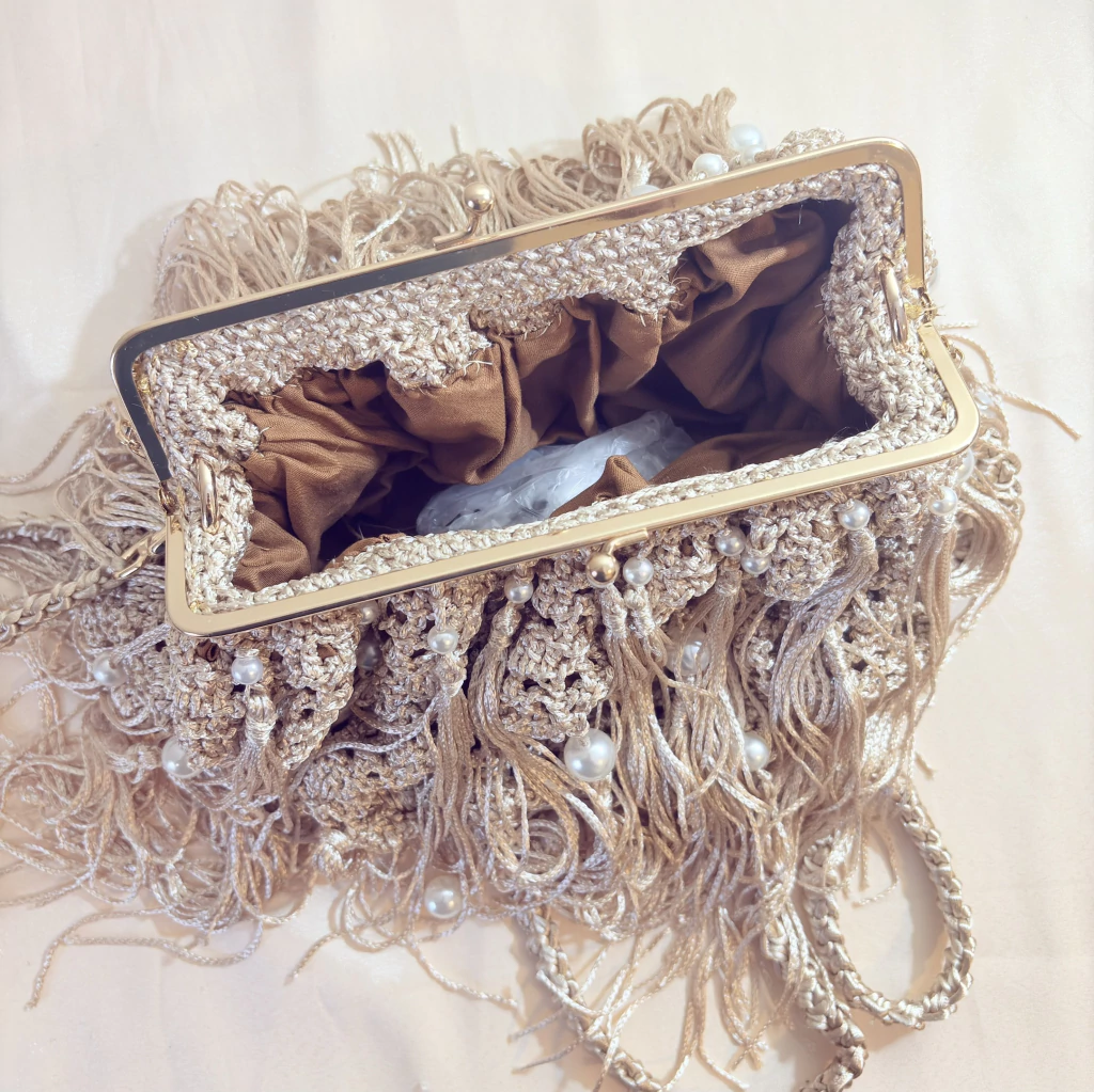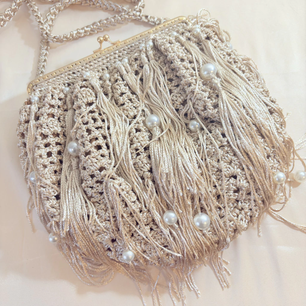 A bolsa de festa champagne em crochê com franjas e pérolas é uma verdadeira joia do artesanato brasileiro. Feita totalmente à mão, cada detalhe dessa peça carrega delicadeza, textura e elegância, tornando-a perfeita para quem busca um acessório exclusivo para casamentos, formaturas e eventos sociais — seja durante o dia ou à noite.
