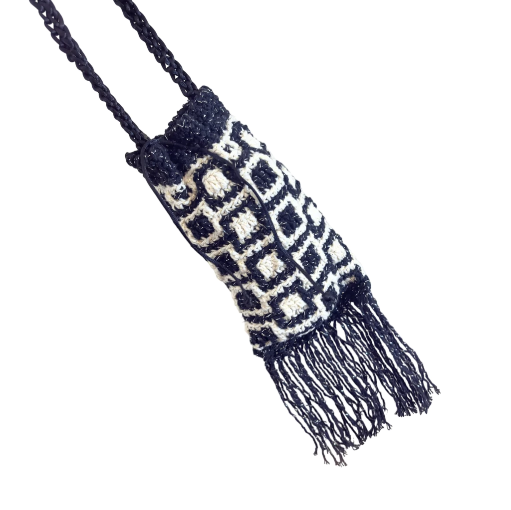 A bolsa lateral pequena em crochê quadriculado preto e branco é o equilíbrio perfeito entre artesanato moderno e praticidade. Com formato retangular compacto, ela traz uma proposta leve e estilosa para o dia a dia, sendo ideal para quem gosta de peças feitas à mão e cheias de personalidade.