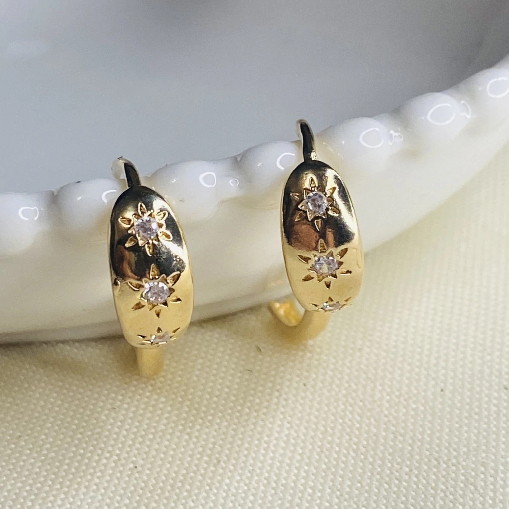Feito em folheado 18K, este brinco é ideal para quem busca a combinação perfeita entre sofisticação e estilo contemporâneo. Seu design com estrelas e pedras adiciona um charme especial, tornando-o uma peça única.