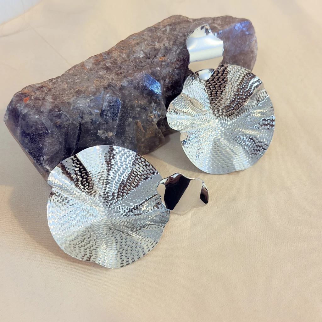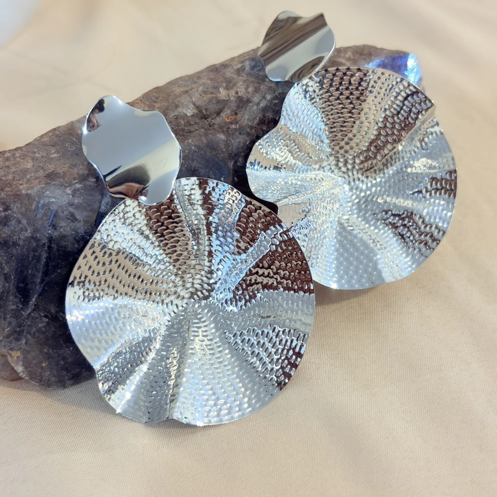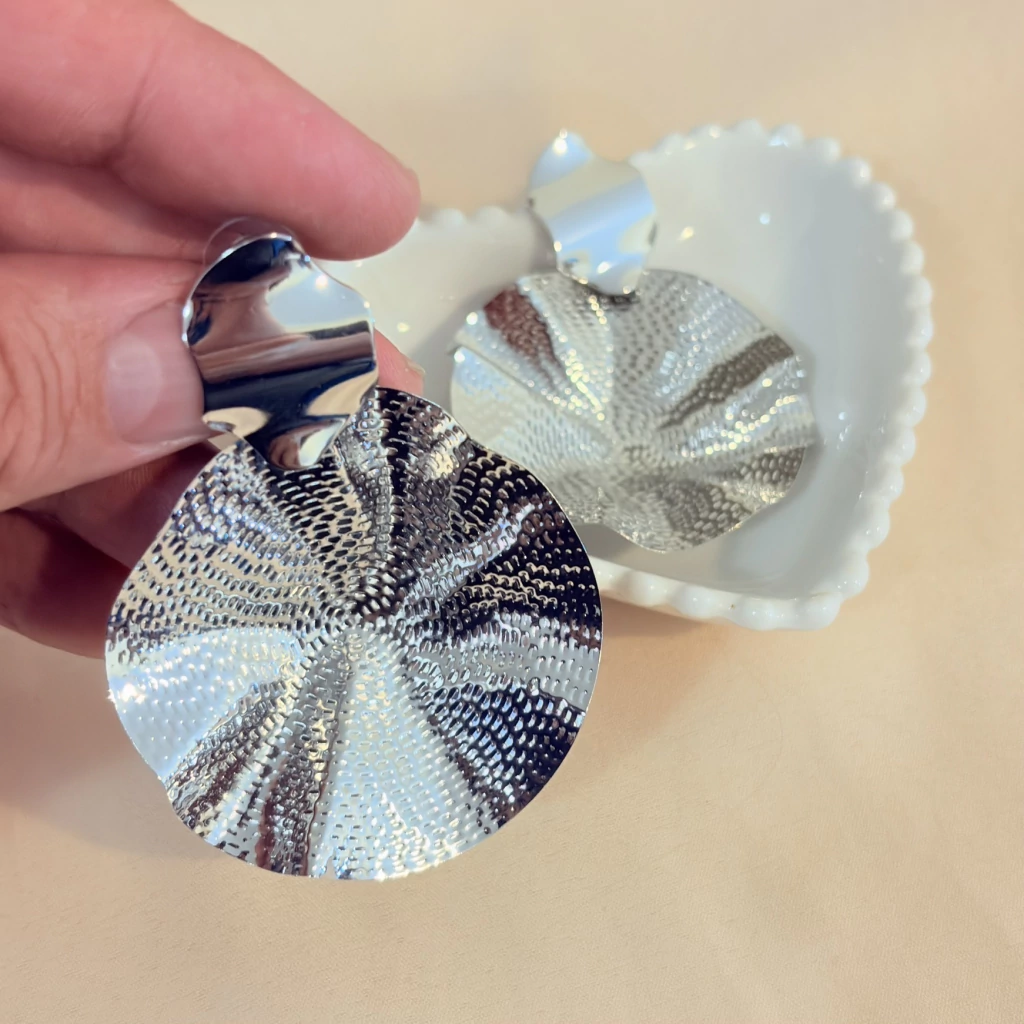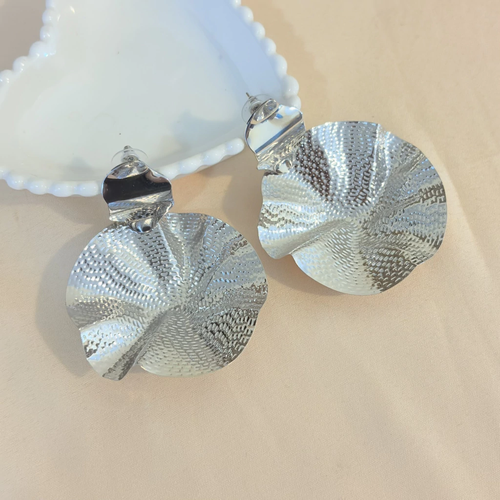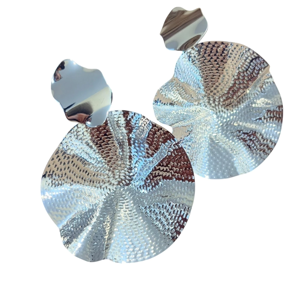 Este brinco prateado é uma celebração do design moderno: formas onduladas, movimento elegante e textura delicada que capta a luz com suavidade. A base ondulada cria um visual fluido e contemporâneo, enquanto o pingente oval também ondulado, com pequenos relevos, acrescenta profundidade e charme à peça.