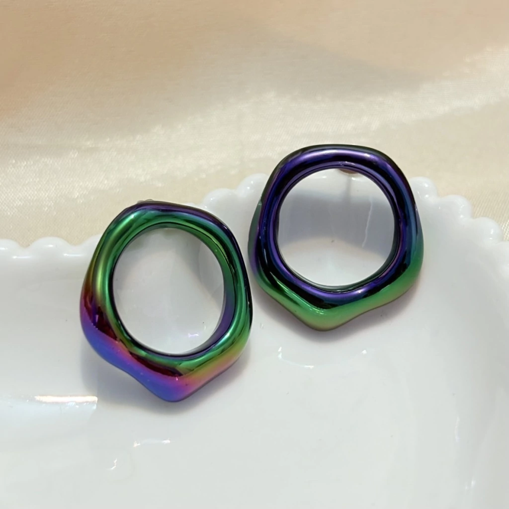 O brinco redondo orgânico roxo boreal é uma peça moderna, vibrante e cheia de personalidade. Seu design em formato redondo orgânico traz um visual fluido e contemporâneo, enquanto a aplicação acrílica com efeito boreal roxo cria reflexos únicos que mudam conforme a luz — um charme sofisticado e atual.
