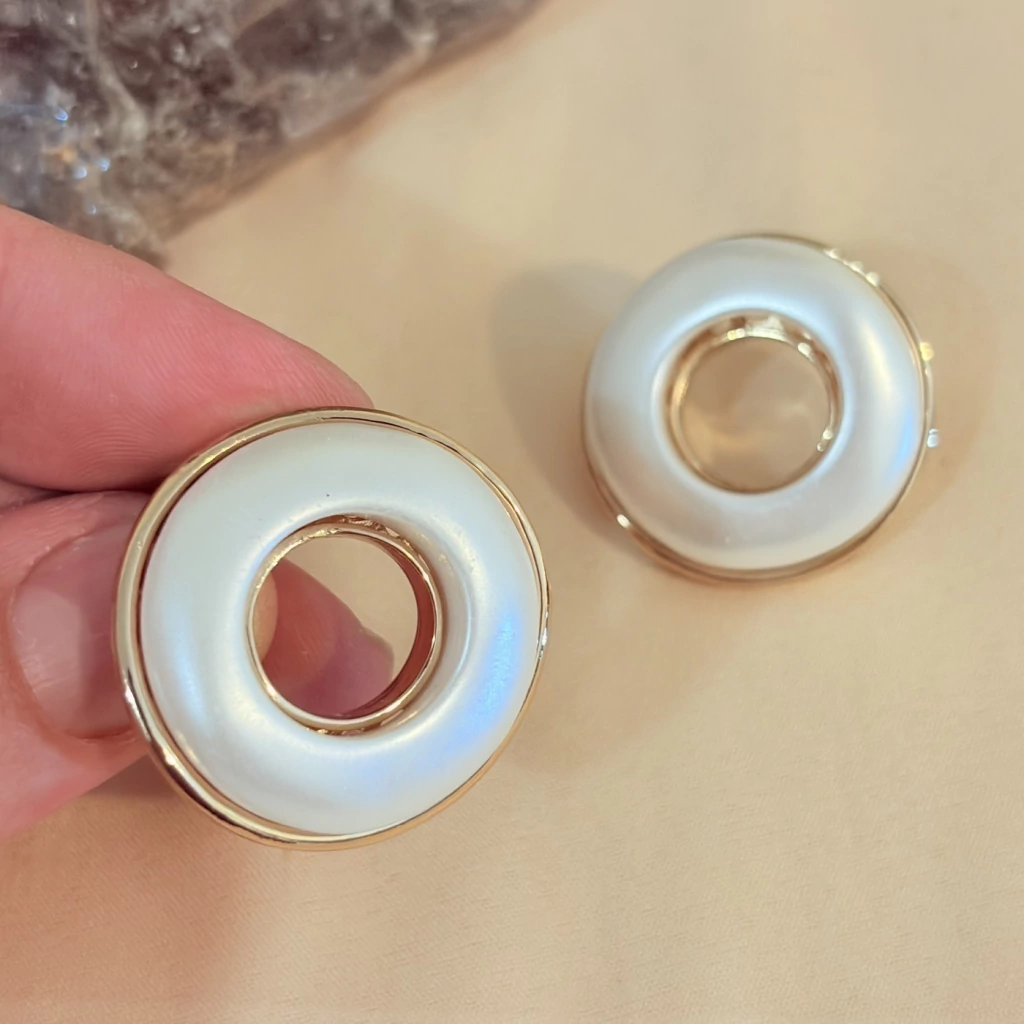 Este brinco redondo dourado é uma daquelas peças que unem presença e suavidade com maestria. O design circular, com aro vazado no centro, cria um visual moderno e clean, enquanto a aplicação de acrílico branco perolado adiciona luminosidade e um toque de elegância que lembra as semi joias mais finas.