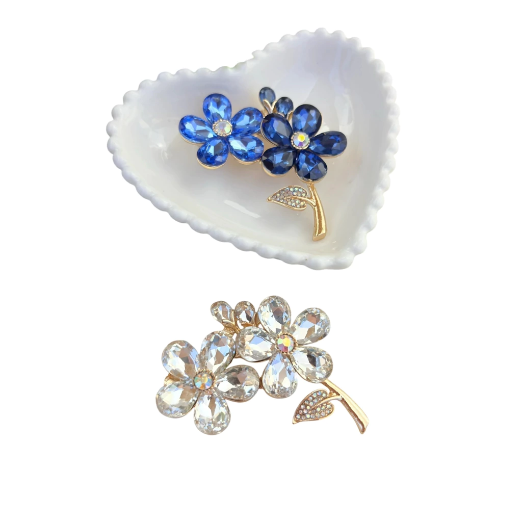 Confeccionado em base dourada, o modelo está disponível em duas versões de cores: branco (clássico e versátil) ou azul (marcante e sofisticado). O fecho de alfinete garante praticidade e segurança no uso, permitindo aplicar o broche em roupas, bolsas, lenços ou chapéus. Uma peça que transforma qualquer produção com elegância e brilho.