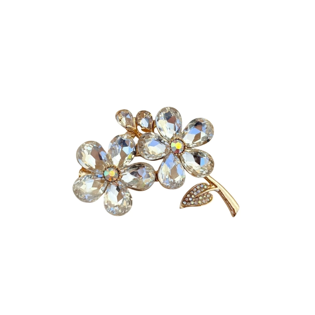 O broche flor grande com pedras brilhantes é um acessório imponente e elegante, perfeito para quem gosta de peças de destaque. Seu design apresenta uma flor em tamanho grande, com pétalas decoradas por pedras brilhantes que refletem a luz de maneira sofisticada.