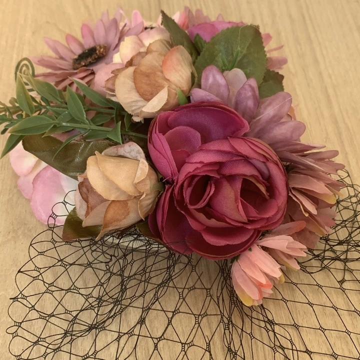 Possui presilha estilo bico de pato para prender, com flores e véu lateral.