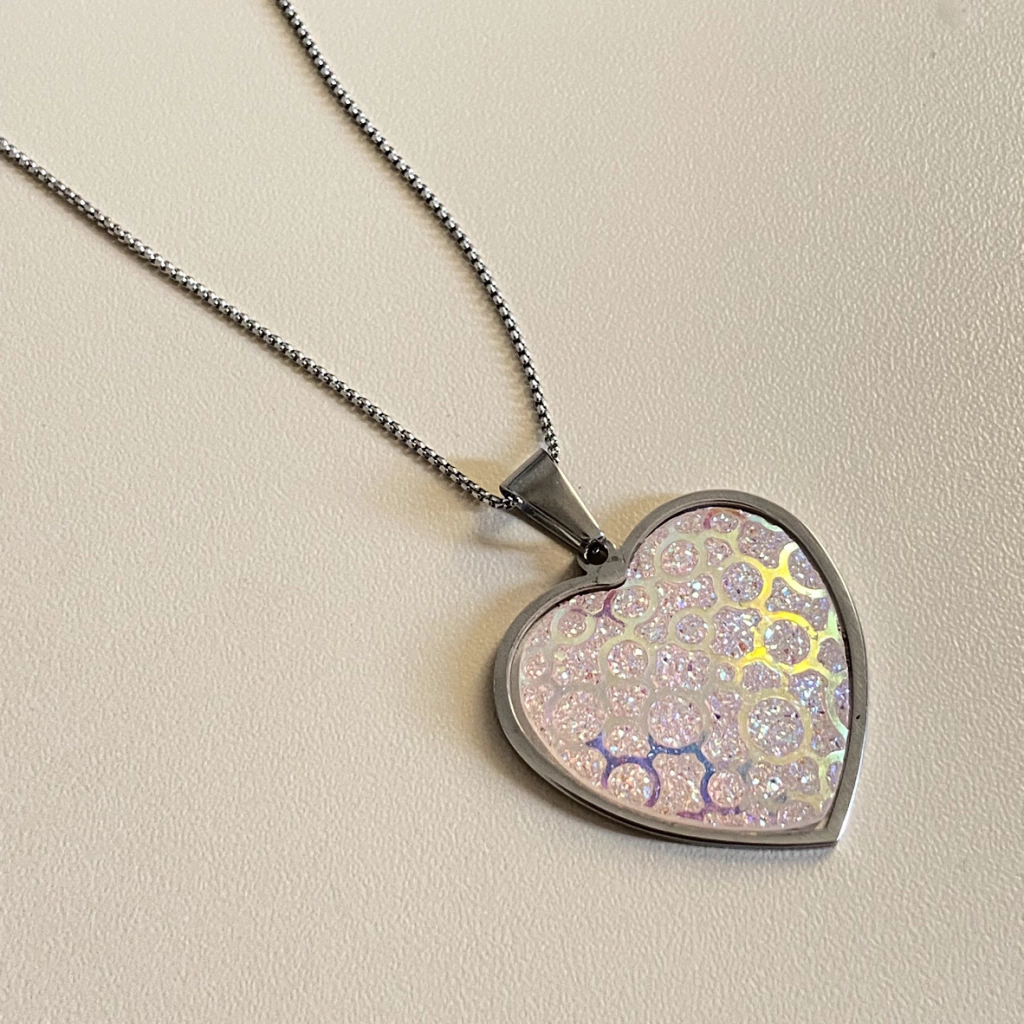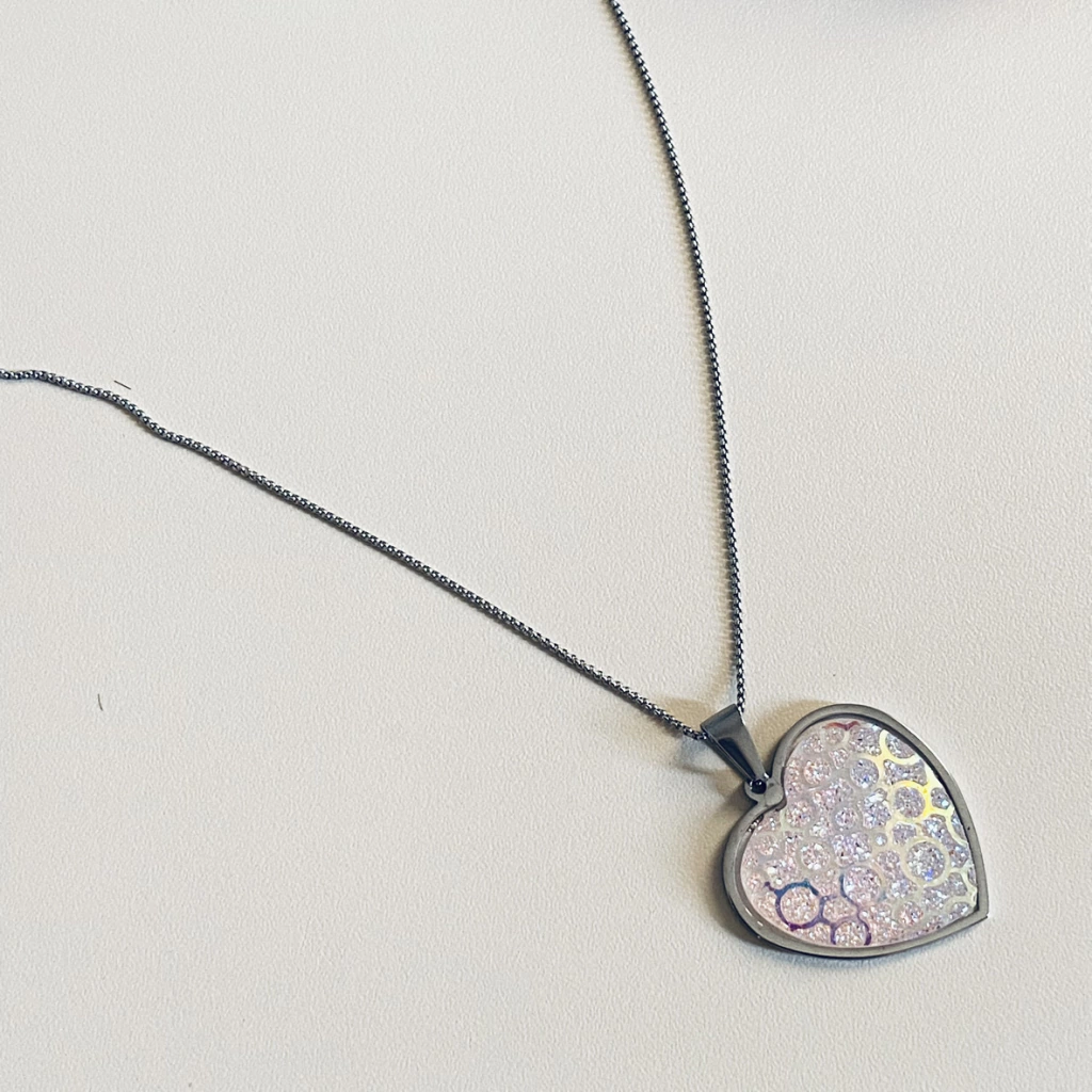 Feito com corrente fina e um pingente de coração com coloração boreal brilhante.
