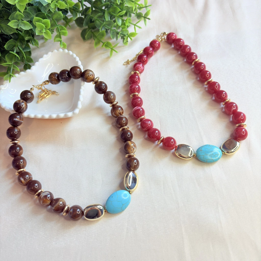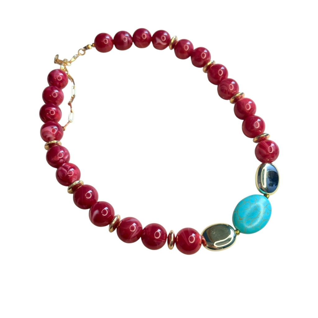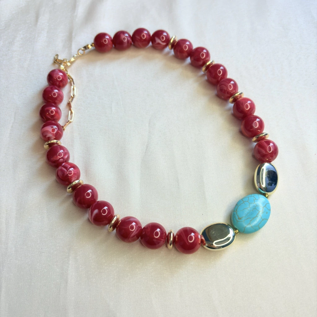 Compre aqui o Colar de esferas marmorizadas nas cores vermelho ou marrom, com pedra central verde água e detalhes dourados. Elegância artesanal com toque moderno.