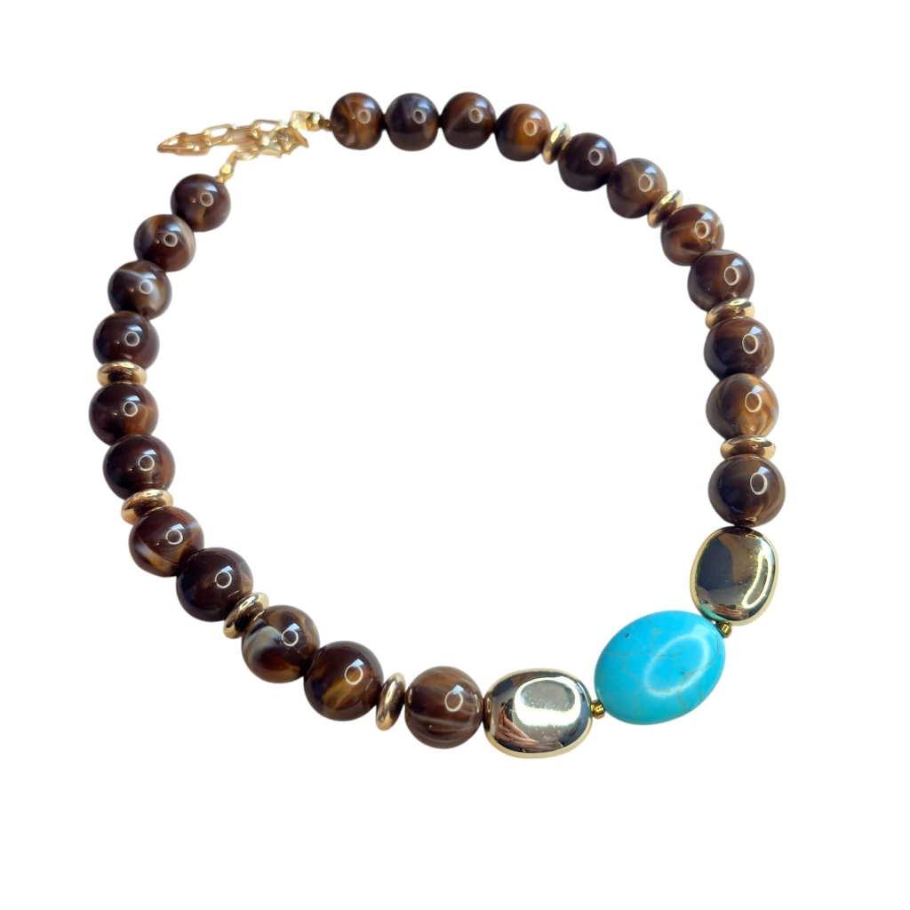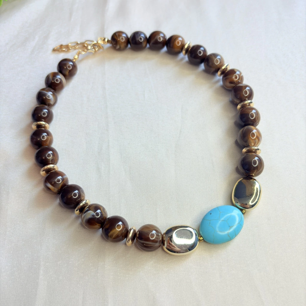 O Colar com Esferas Marmorizadas e Pedra Central Verde Água é a escolha perfeita para quem busca sofisticação com um toque natural. Sua composição intercala bolas marmorizados – disponíveis nas cores vermelho ou marrom – com pequenos detalhes dourados que trazem brilho e equilíbrio ao visual.