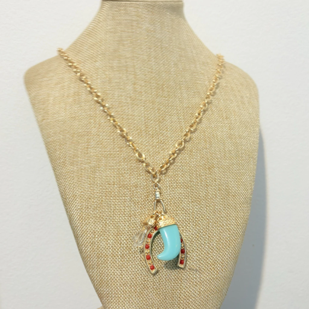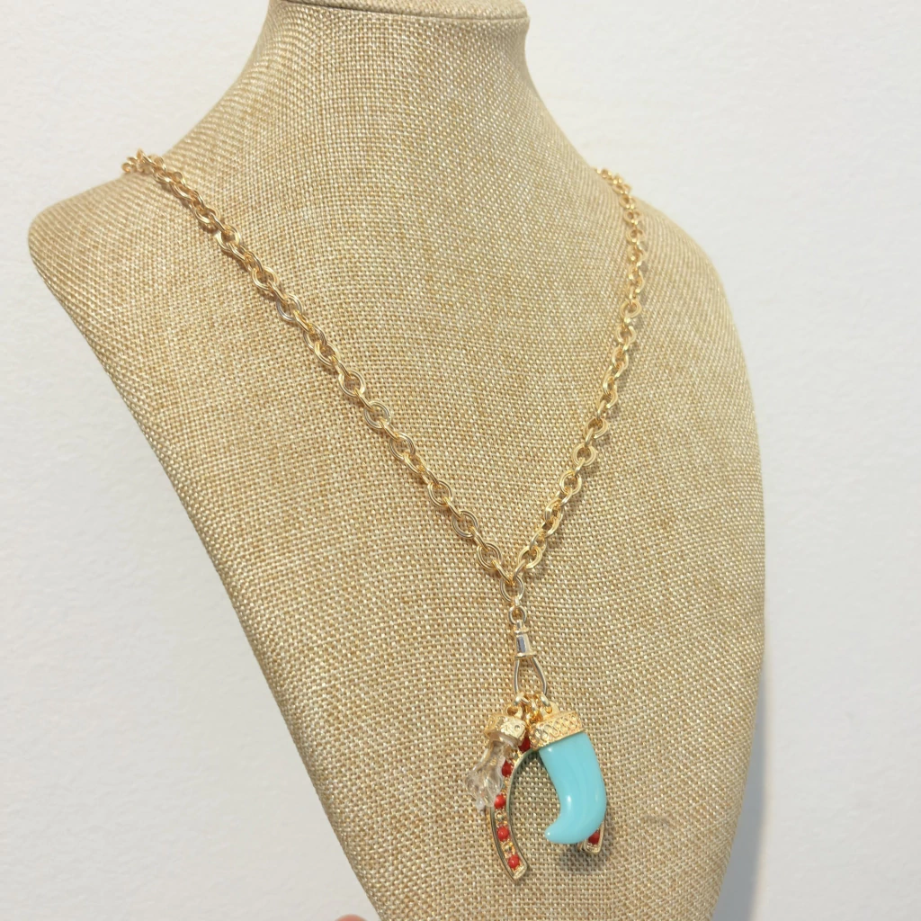 Compre aqui o Colar comprido de patuás dourado com pingente de dente de tigre em acrílico, ferradura e figa. Amuleto da sorte com estilo, perfeito para looks modernos e cheios de personalidade.