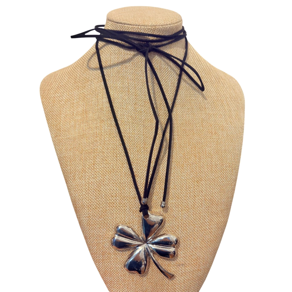 Compre aqui o Colar com cordão de courino preto e pingente grande de trevo de quatro folhas prateado. Um amuleto de sorte com estilo moderno e versátil.