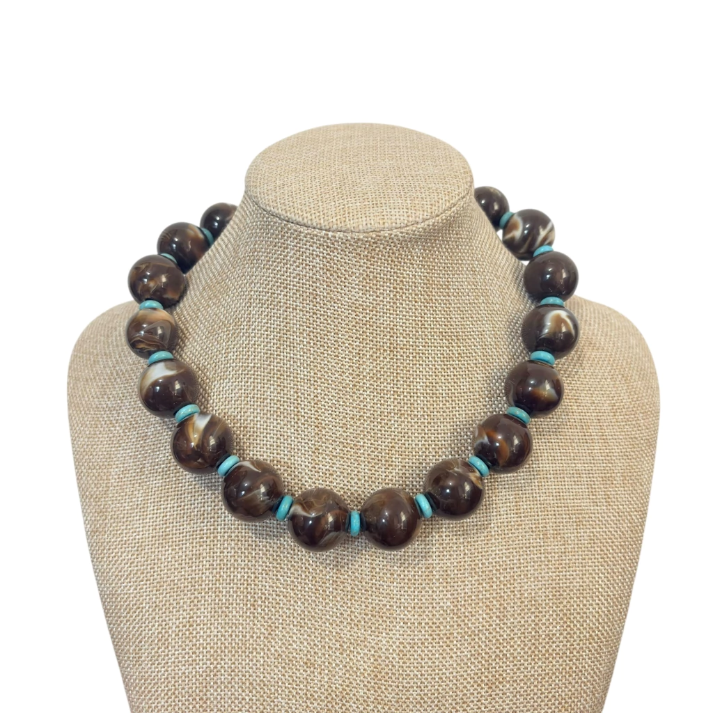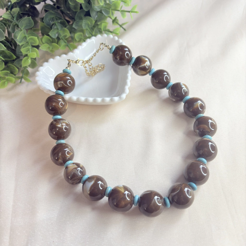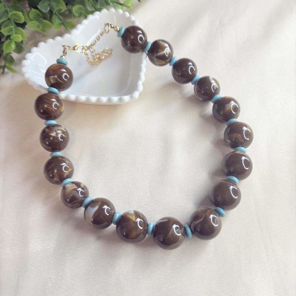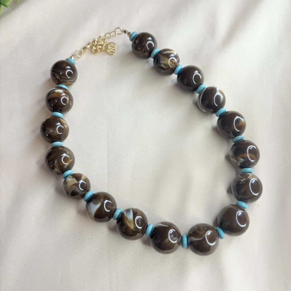 O Colar de Esferas Marrons com Detalhes Marmorizados é uma peça encantadora e atemporal. Com esferas grandes em tom marrom com detalhes marmorizado, ele se destaca pelos detalhes intercalados em verde água, que trazem contraste delicado e sofisticado ao visual.