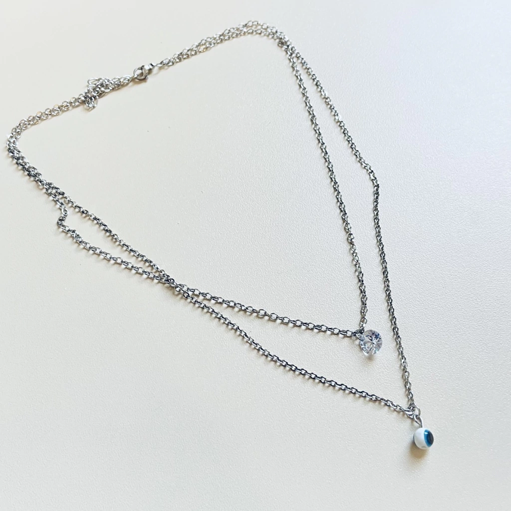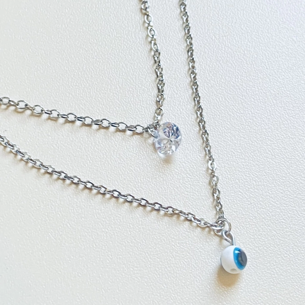 Colar Duplo com Pedra e Olho Grego em Aço Inox Hipoalérgico.
