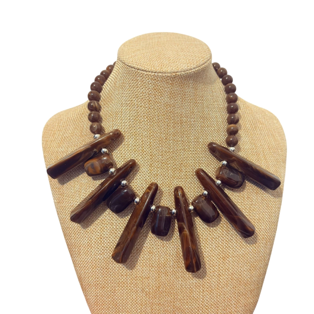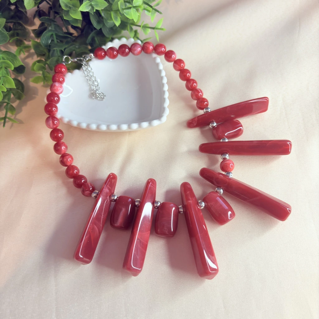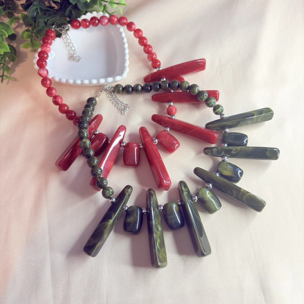 Compre aqui o Colar com pedras acrílicas em tons vermelho, verde ou marrom, com design que remete a colares de ossos indígenas. Peça de destaque com visual étnico e moderno.
