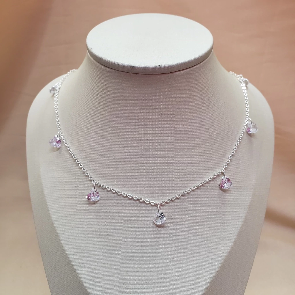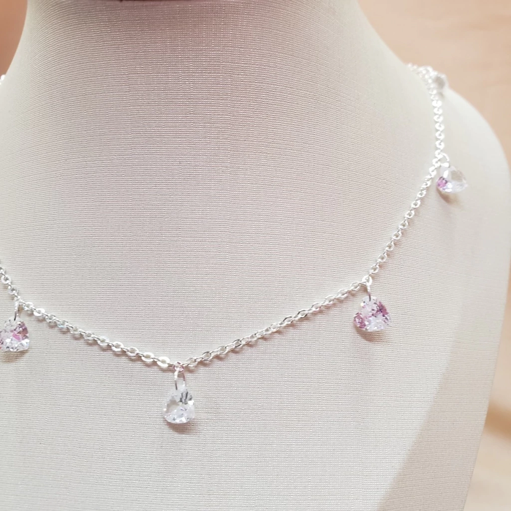 Pingentes: Pedras de zircônia em formato de coração, com brilho intenso.