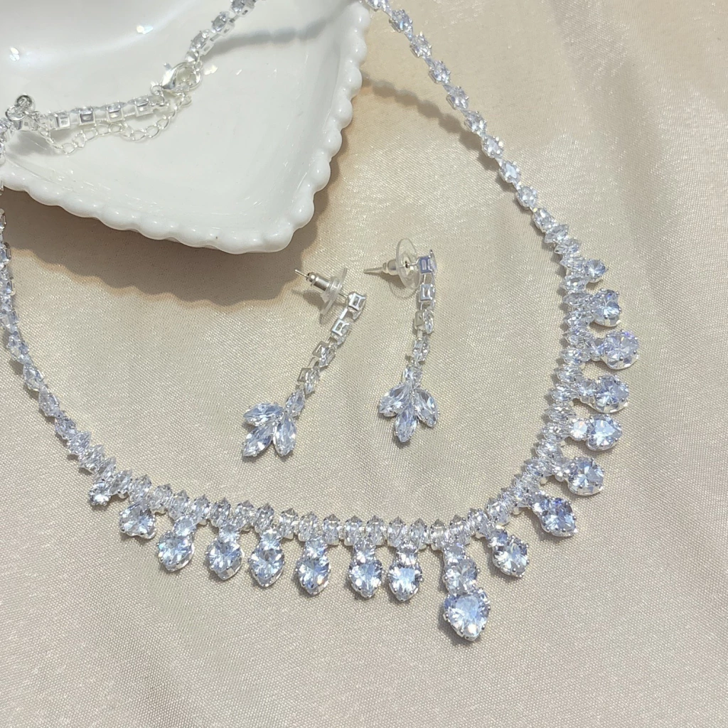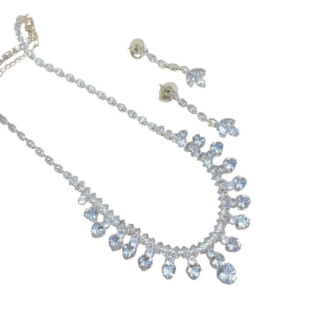 O conjunto acompanha um brinco combinando, com design harmonizado para completar o look com equilíbrio e elegância.