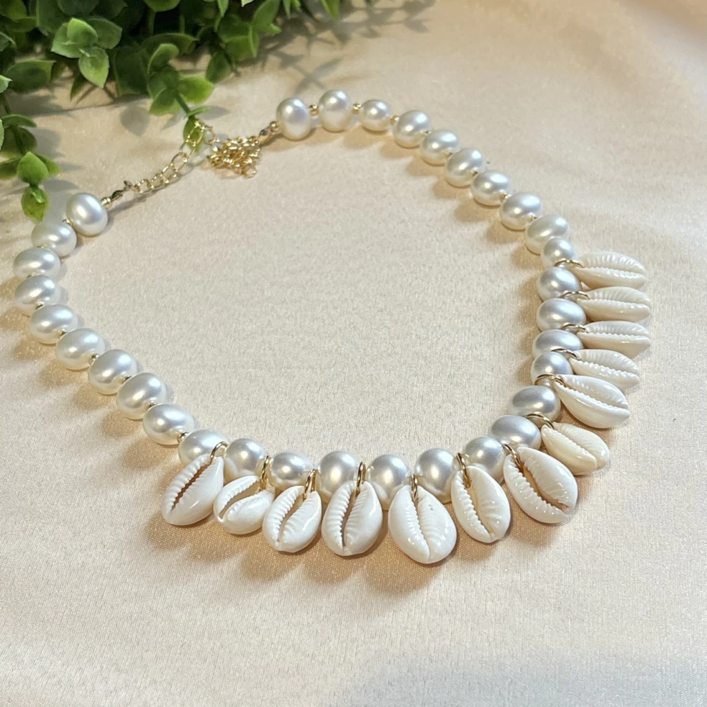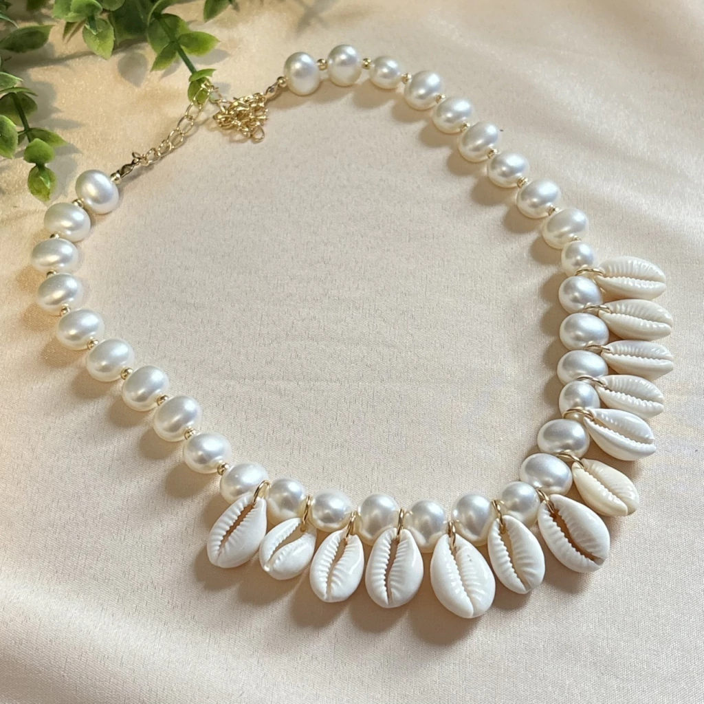 Este colar encantador é composto por pérolas achatadas, elegantemente intercaladas com bolinhas douradas, criando um contraste deslumbrante. Os pingentes de búzios pendurados adicionam um charme especial, evocando a beleza do mar e a leveza do verão.