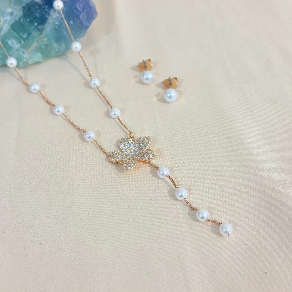 O destaque fica por conta do pingente de flor cravejada com micro zircônias, que traz luminosidade e um toque romântico ao visual. Para completar a composição, o conjunto acompanha brinco de pérola combinando, criando harmonia e refinamento imediato.