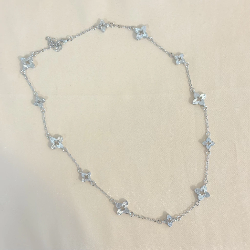 O colar de trevos com micro pedrinhas de zircônia é uma peça que une delicadeza, brilho e o charme simbólico do trevo da sorte. Com trevos cravejados distribuídos ao longo da corrente e elos finos intercalados, o colar cria um visual luminoso, fluido e elegante — lembrando joias finas e sofisticadas.