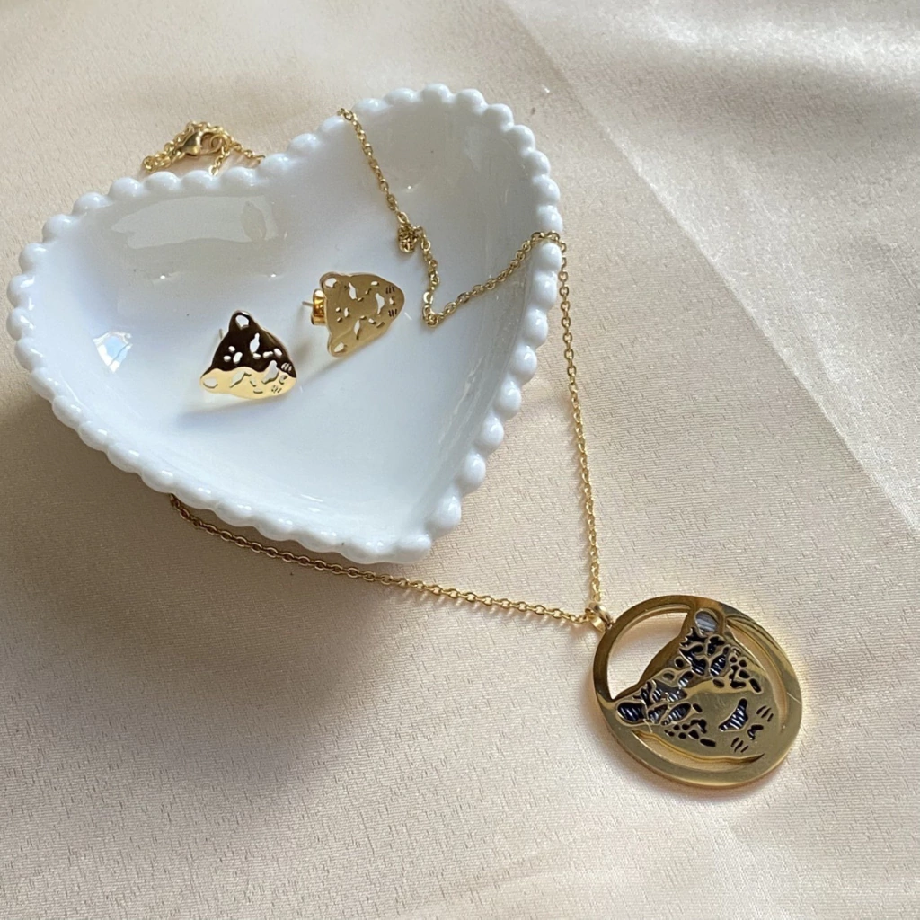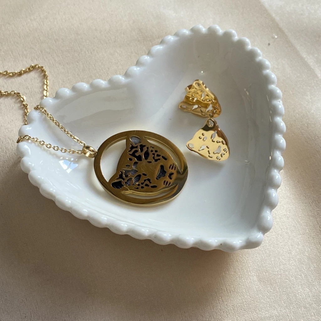 Não perca a chance de brilhar com este conjunto incrível! Adquira agora o seu Colar Onça Pintada Dourada com Brinco Aço Inox e transforme seu estilo!