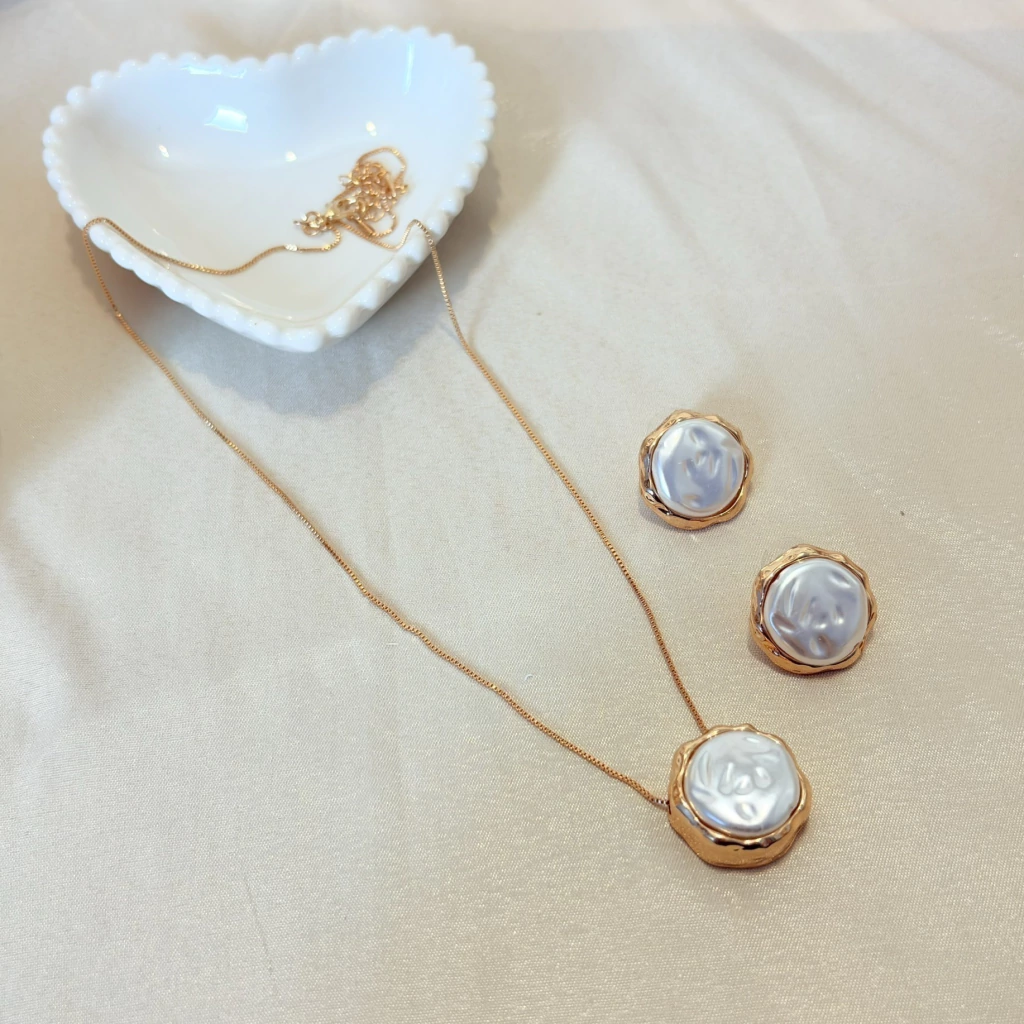 O conjunto de colar e brinco com pingente redondo imitando madrepérola é a escolha perfeita para quem busca elegância suave com toque clássico. A base dourada traz luminosidade e sofisticação, enquanto o pingente redondo — com acabamento que imita madrepérola — adiciona um brilho natural e delicado ao conjunto.