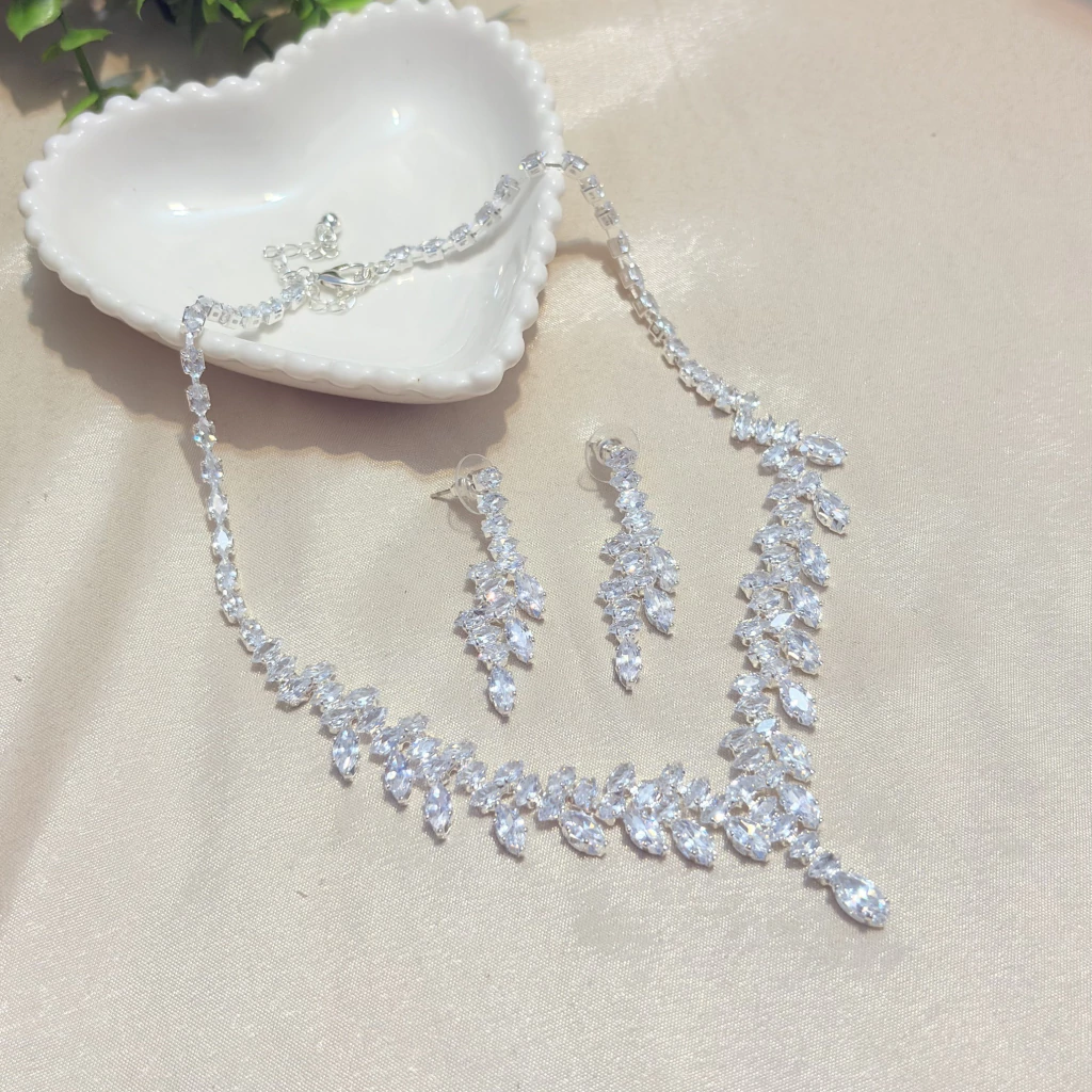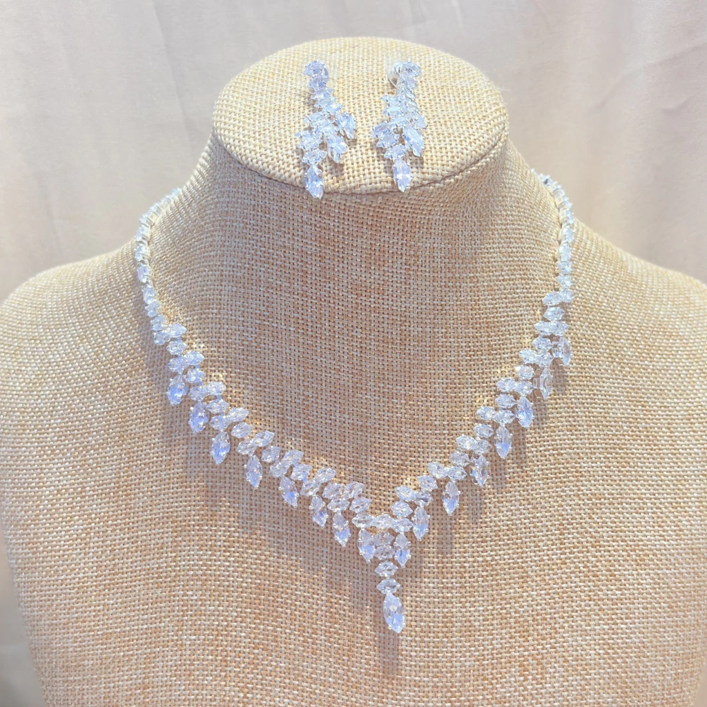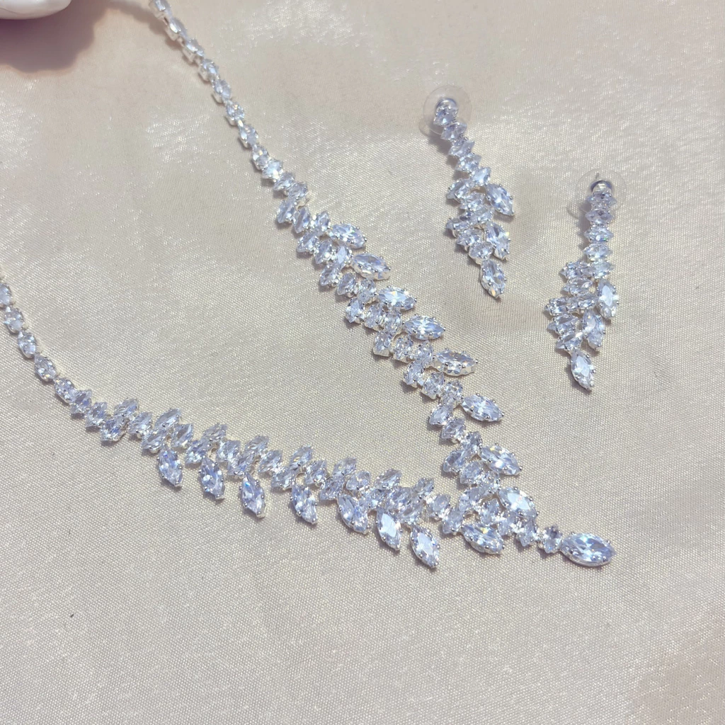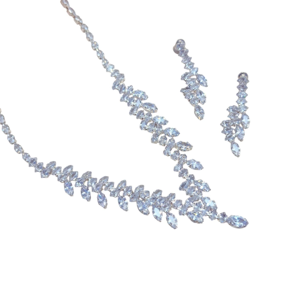 O conjunto prateado de festa com zircônias é sinônimo de brilho e sofisticação. O colar é totalmente cravejado com pedras de zircônia lapidadas em formato de mini gotas, criando um efeito contínuo de luz que valoriza o colo com delicadeza e glamour.