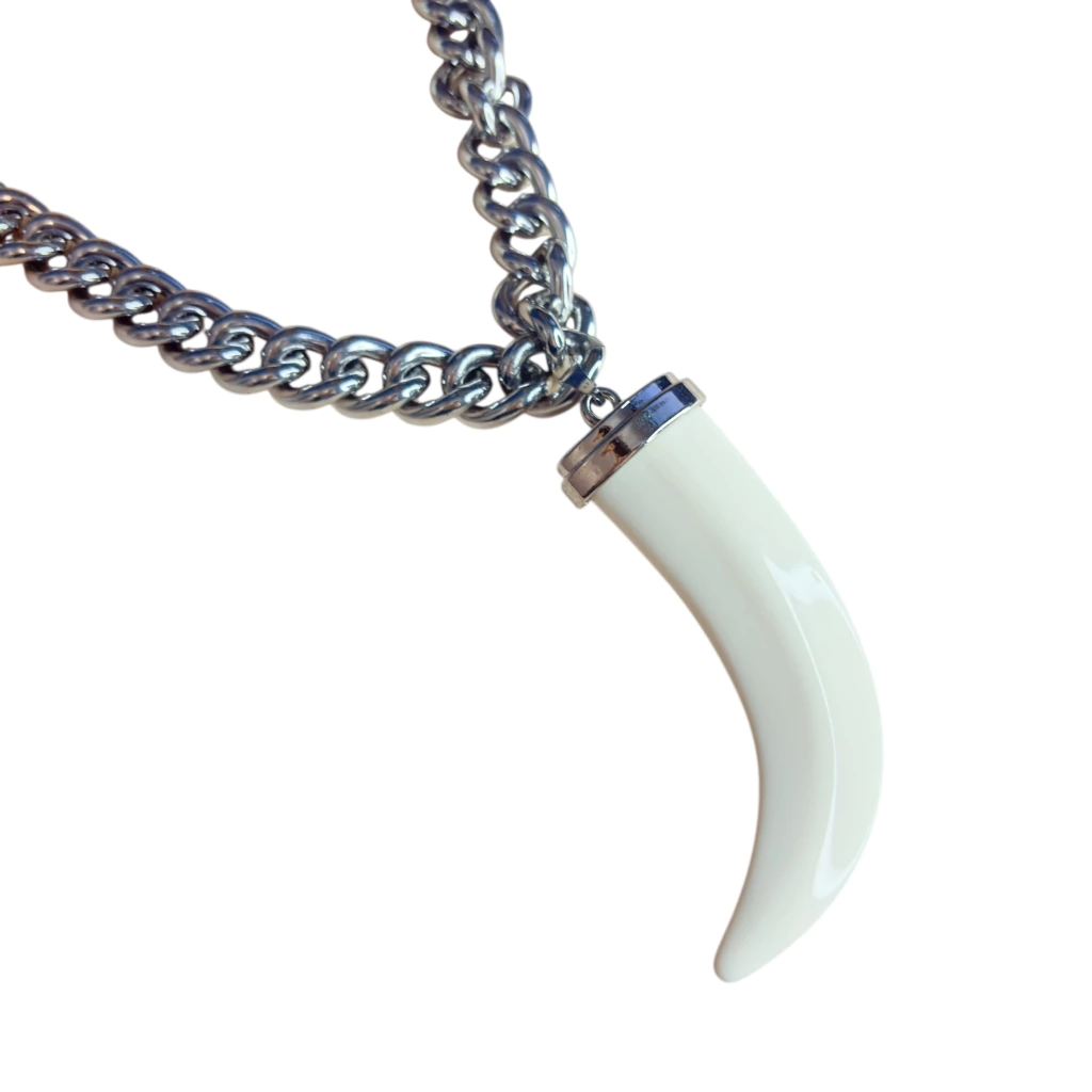 O pingente em formato de dente de tigre estilizado é feito em acrílico resistente e leve, com acabamento que imita o visual natural, trazendo imponência sem perder o conforto. A corrente possui ajuste de comprimento, permitindo versatilidade para diferentes composições – desde colares mais justos ao pescoço até visuais mais longos e despojados.