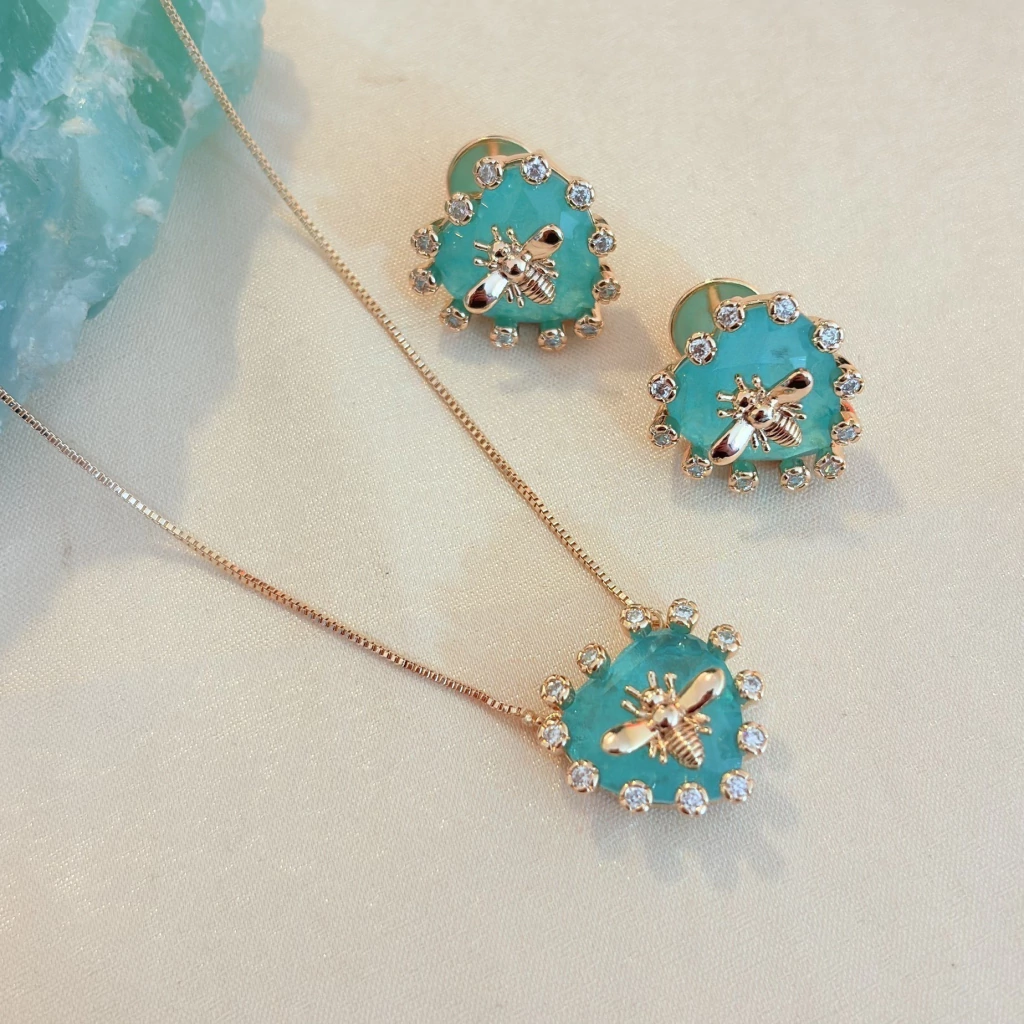 Esta gargantilha é uma joia criada para quem busca exclusividade, brilho e personalidade. O pingente em formato de coração verde esmeralda, lapidado em zircônia de alto brilho, é enfeitado por uma delicada abelha dourada, simbolizando doçura, prosperidade e elegância — um detalhe artístico que transforma a peça em algo verdadeiramente especial.