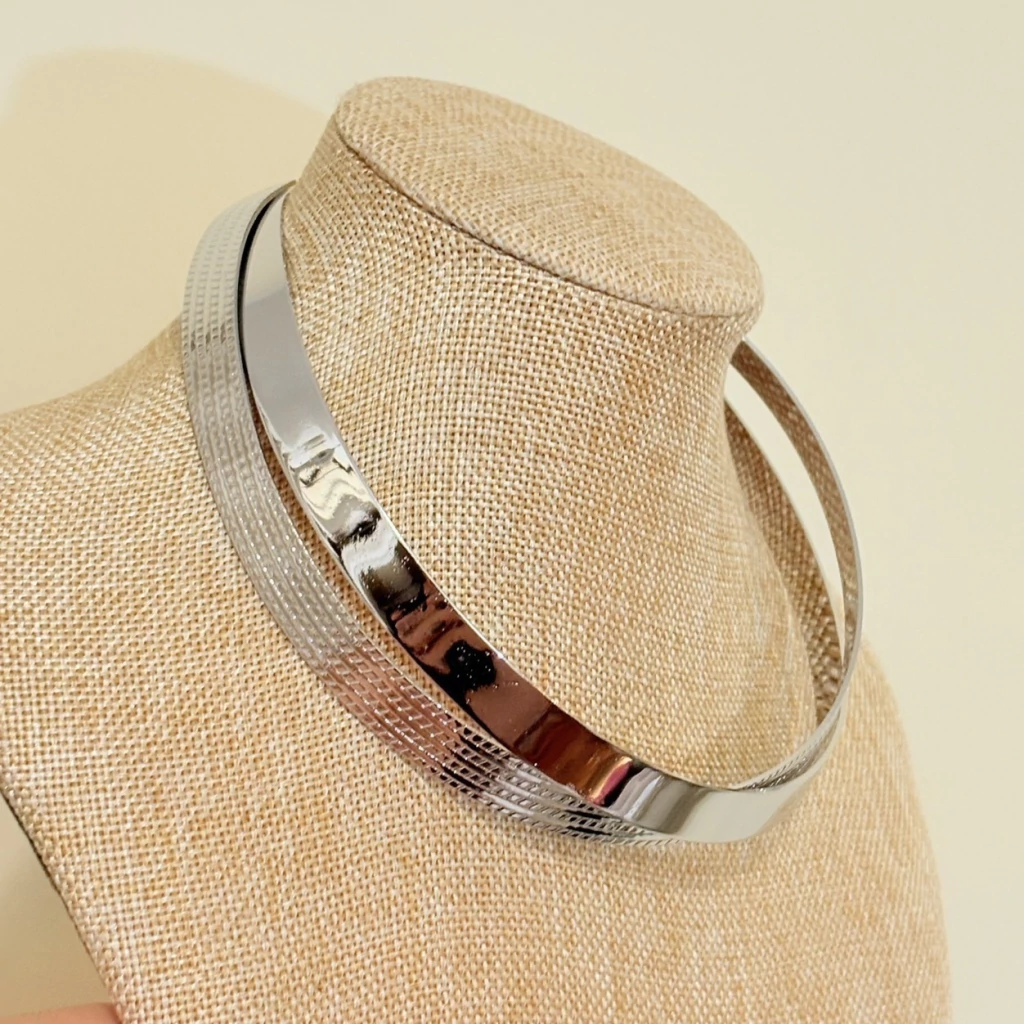 Esta gargantilha de aro larga é uma peça marcante e contemporânea, ideal para quem ama acessórios com design diferenciado. Sua estrutura apresenta dois aros entrelaçados — um totalmente liso e outro com textura sofisticada — criando um contraste elegante e moderno que valoriza o colo com presença e estilo.