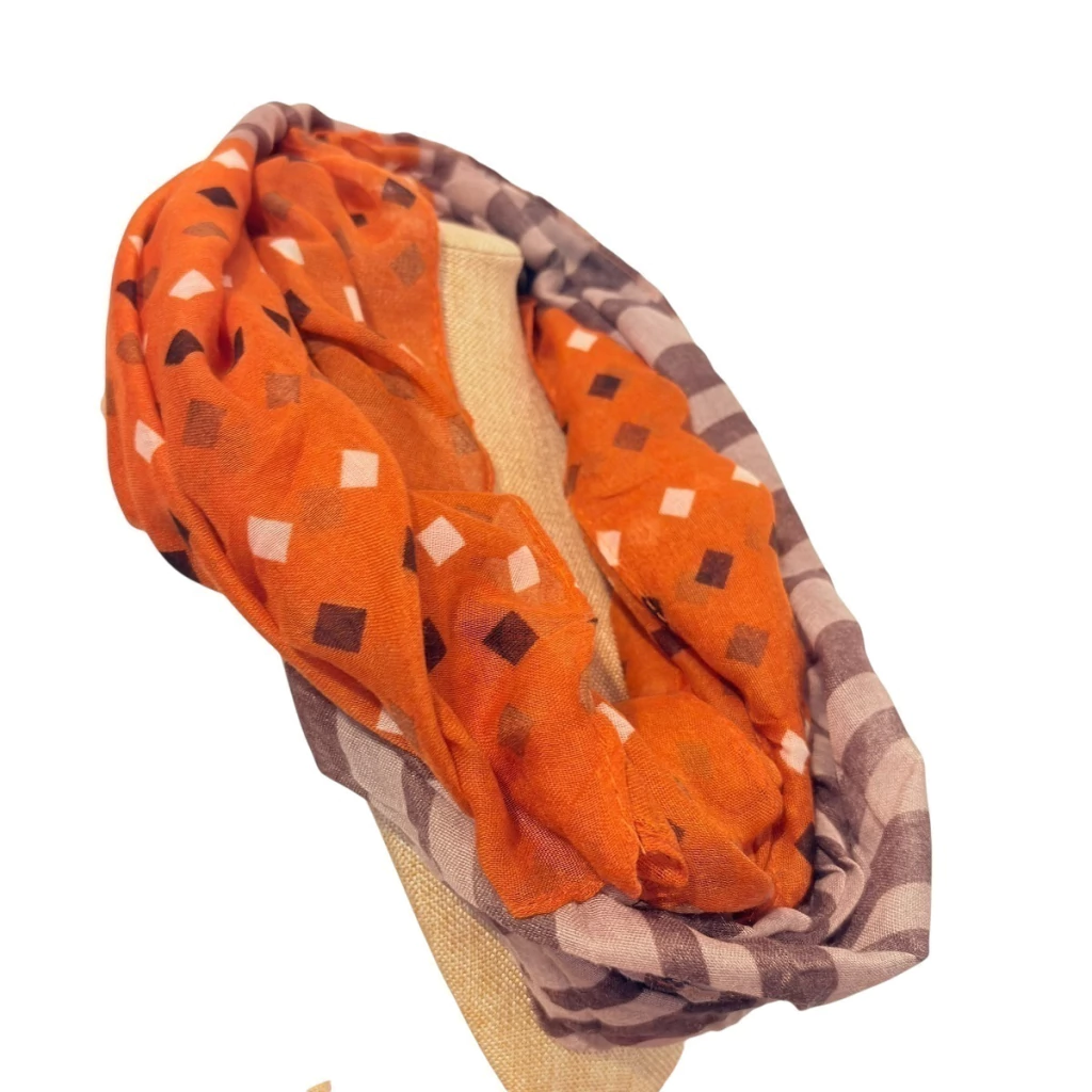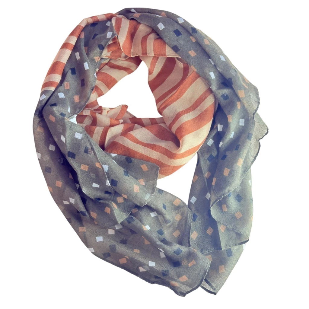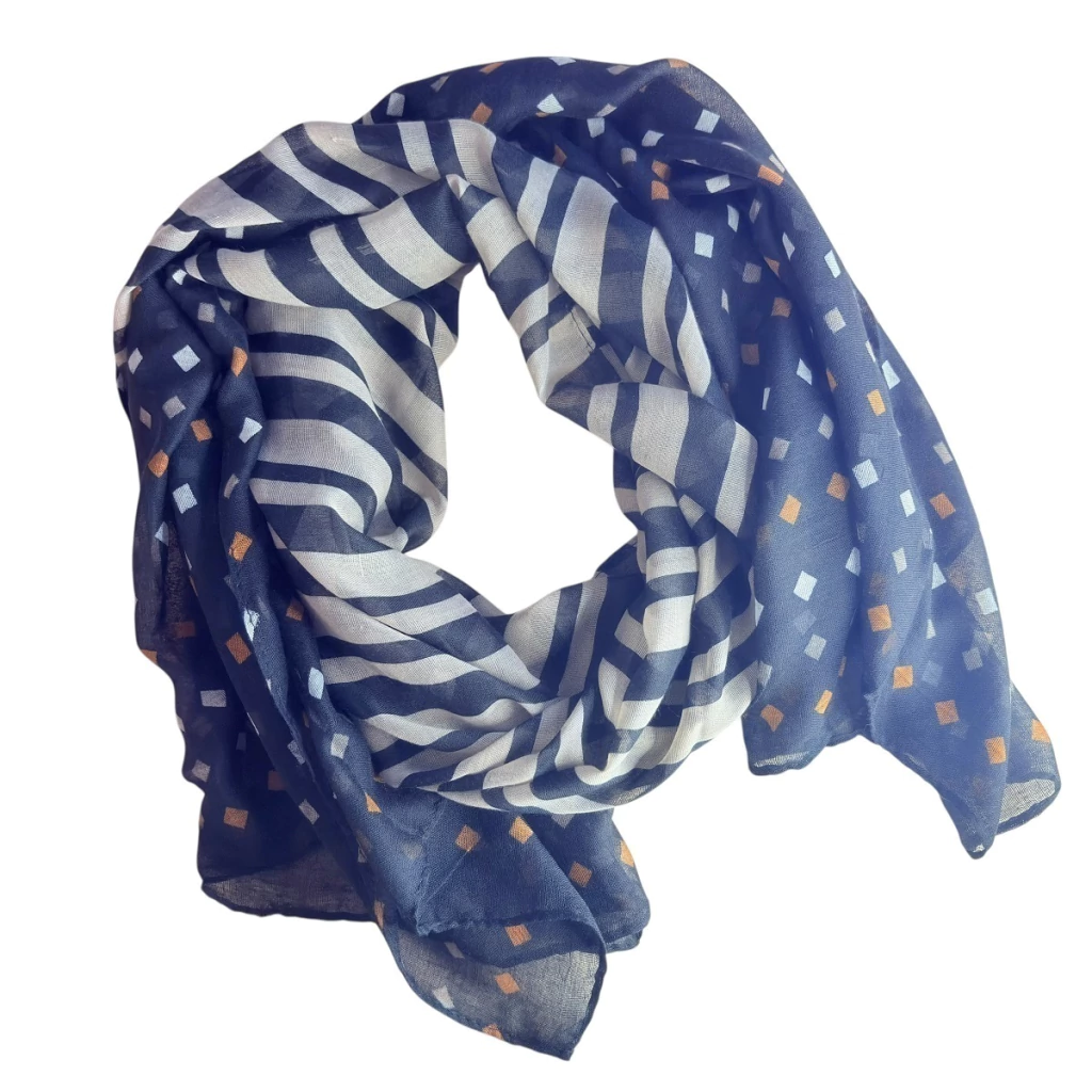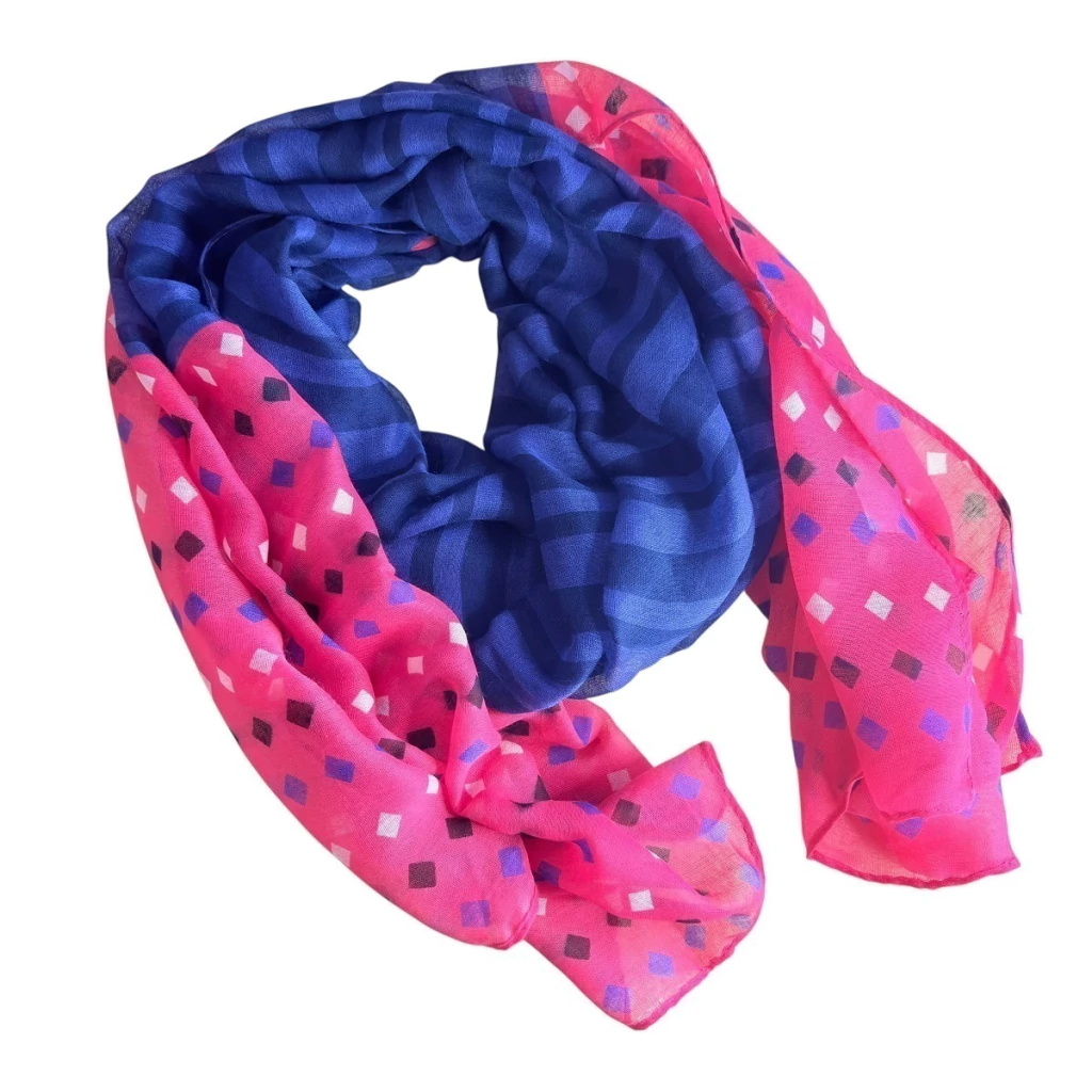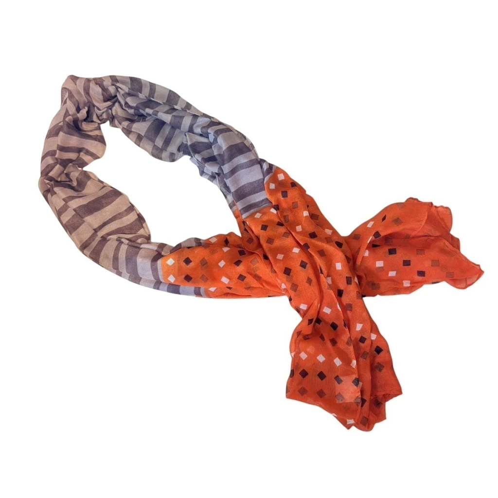 A estampa geométrica mistura listras e quadrados em uma paleta de cores variadas, oferecendo uma proposta moderna, criativa e elegante. Sem franjas, o lenço mantém o acabamento limpo, sofisticado e fácil de combinar com outros acessórios.