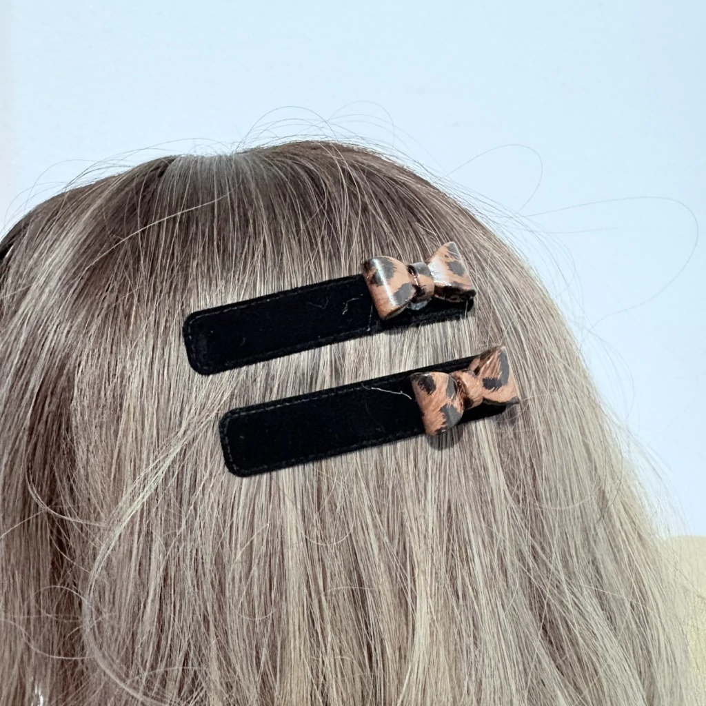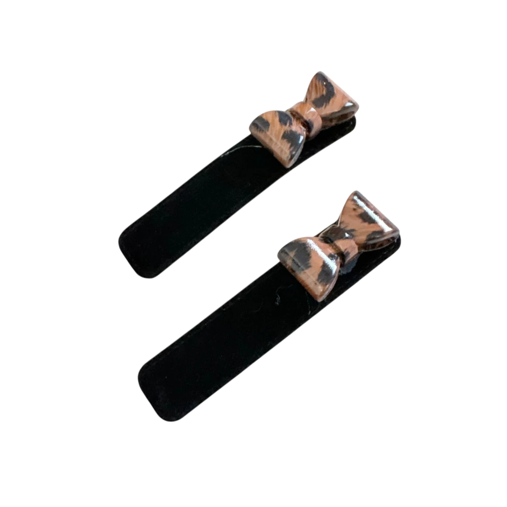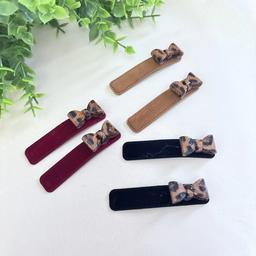 O charme do acabamento aveludado com o brilho do laço de acrílico se encontram neste par de presilhas tic tac tamanho médio, perfeitas para quem ama acessórios delicados e modernos. Uma peça que traz elegância e um toque lúdico para os seus penteados.