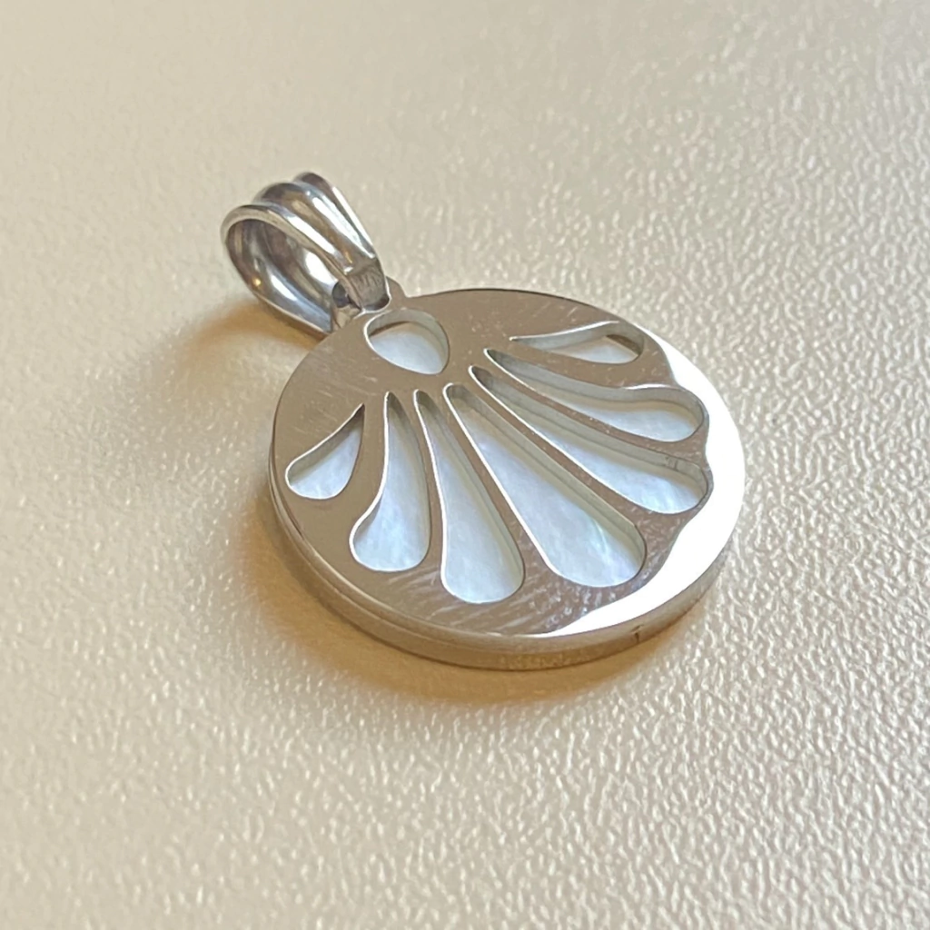 Esse lindo pingente foi fabricado em formato de concha com detalhes desenhados formando uma concha.