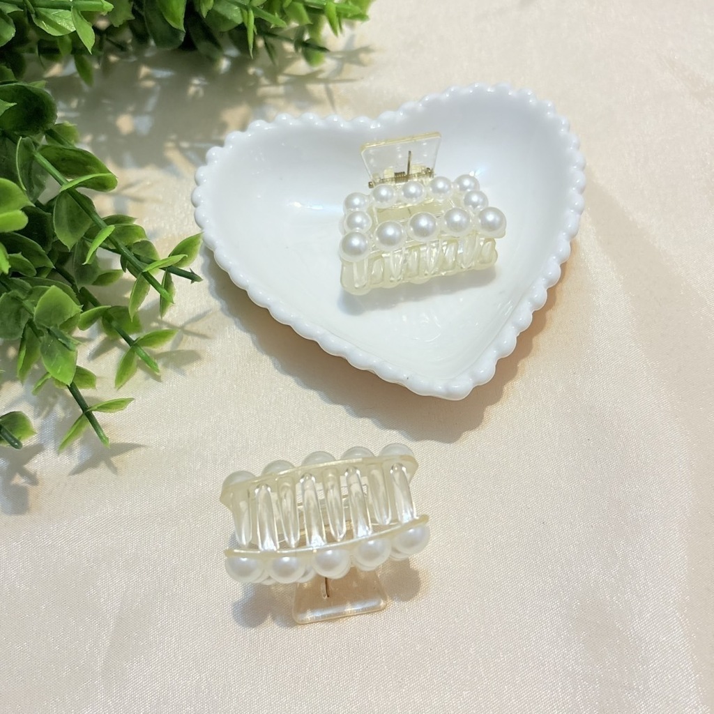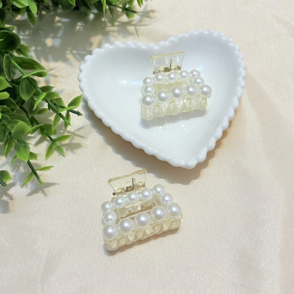 A piranha de cabelo pequena retangular é a escolha perfeita para quem deseja prender pequenas mechas com delicadeza e estilo. Possui mini pérolas brancas coladas que dão um toque clássico e feminino, além de uma base em acrílico transparente que garante leveza e durabilidade. Seu formato compacto é ideal para penteados sutis no dia a dia ou para complementar looks mais sofisticados.
