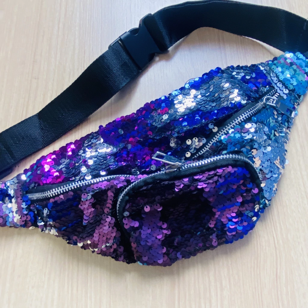 Possui ziper para guardar seus objetos e fita com ajuste, os paetes bordados mudam de cor se virar do outro lado.