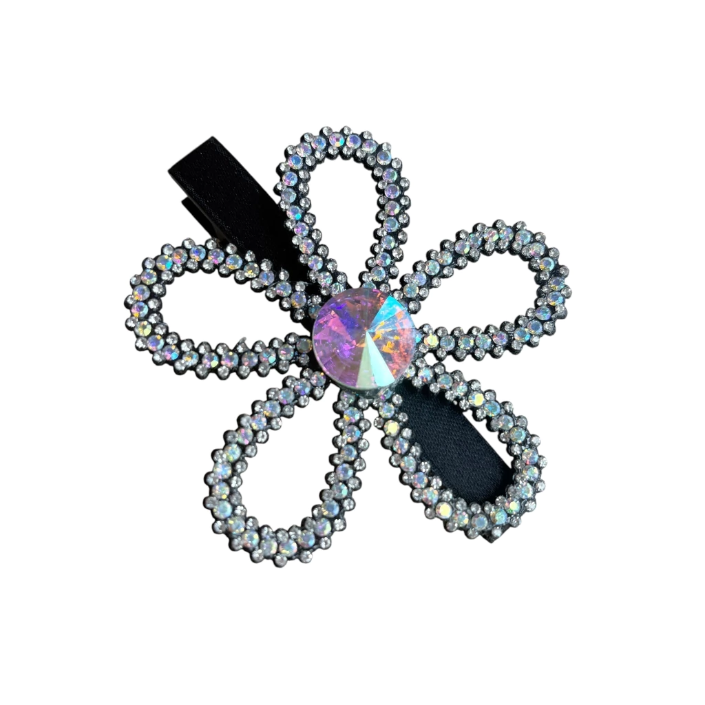 Não perca a chance de enriquecer sua coleção de acessórios com a Presilha de flor grande com pedras brilhantes, design vazado e pedra central no miolo. Com base bico de pato, disponível em prata, dourado e preto.