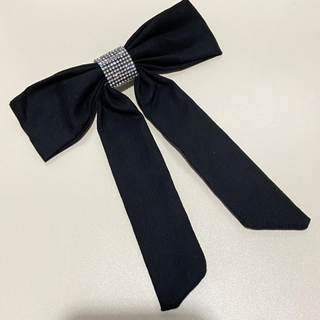 Possui base em presilha de fivela e tecido com enfeite de strass.