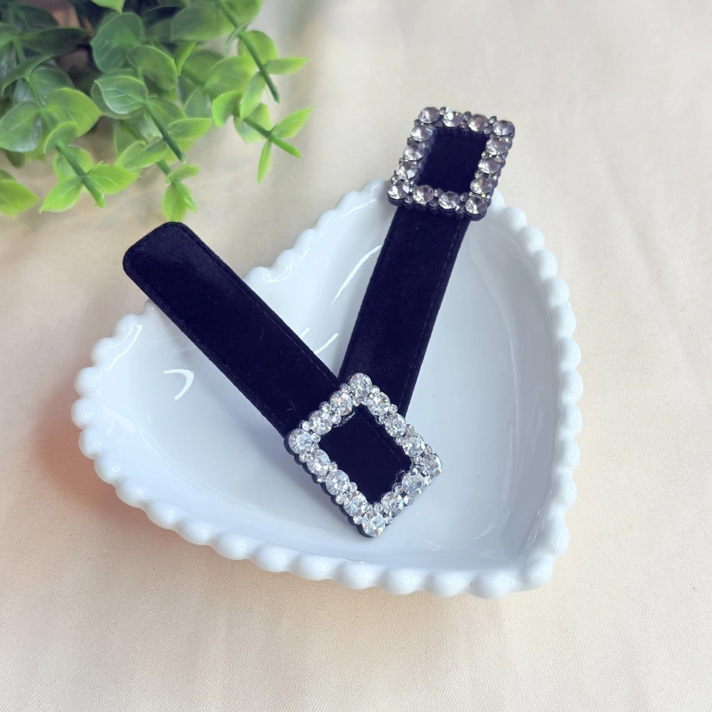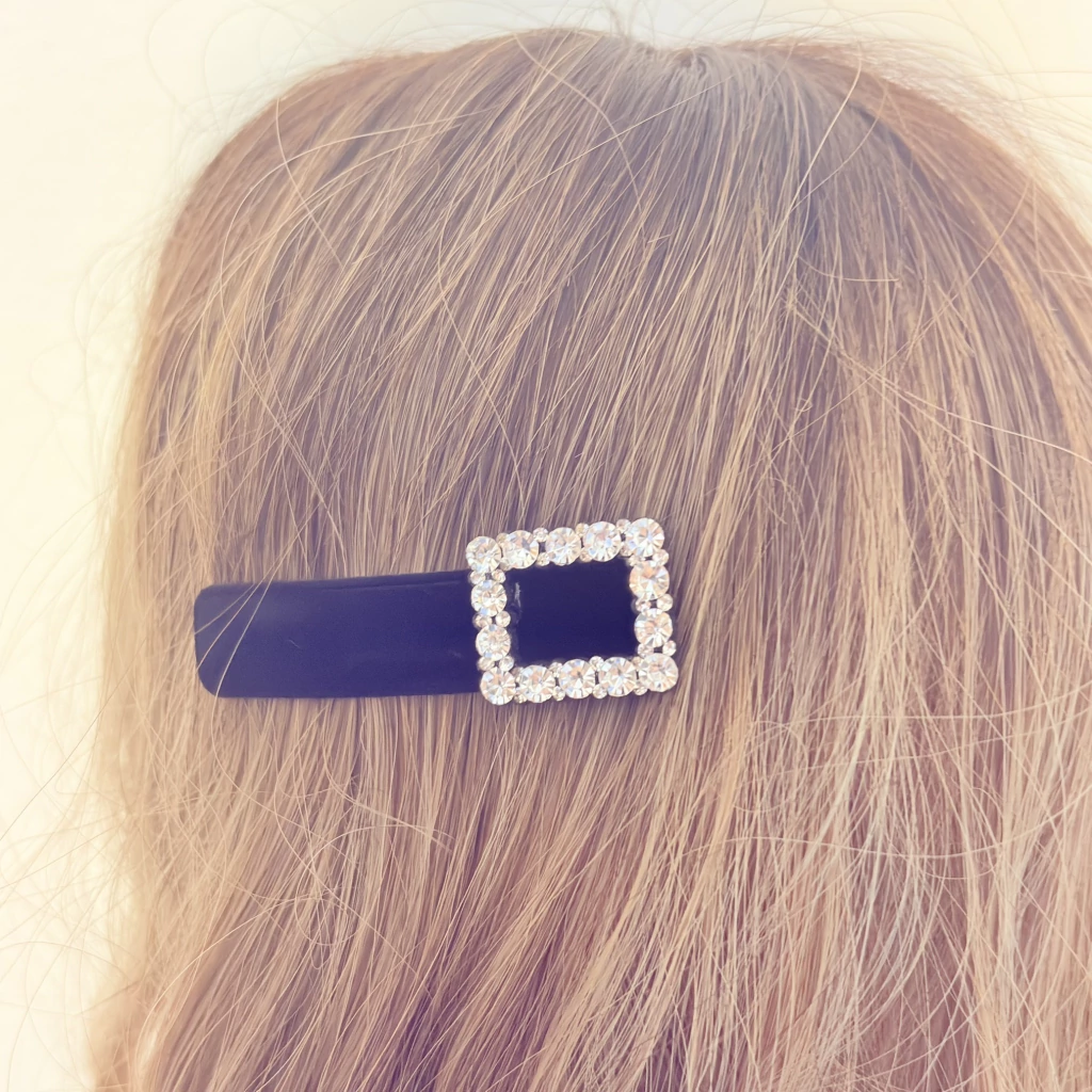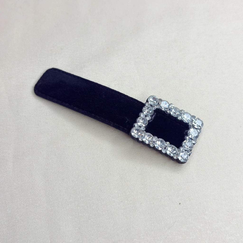 Não perca a chance de enriquecer sua coleção de acessórios com a Presilha tic tac com base de veludo preto e enfeite quadrado com pedras brilhantes. Sofisticação e firmeza em um acessório elegante para o cabelo.