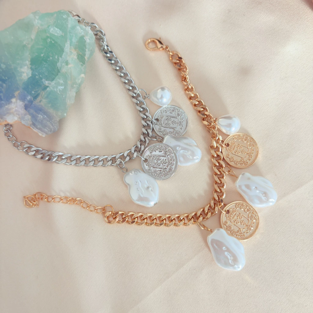 Esta pulseira de metal com pingentes de moeda e pérola é a escolha ideal para quem adora acessórios com personalidade, brilho e movimento. Cada pingente foi delicadamente posicionado para criar um balanço leve e gracioso ao caminhar, transformando a peça em um detalhe encantador no pulso.