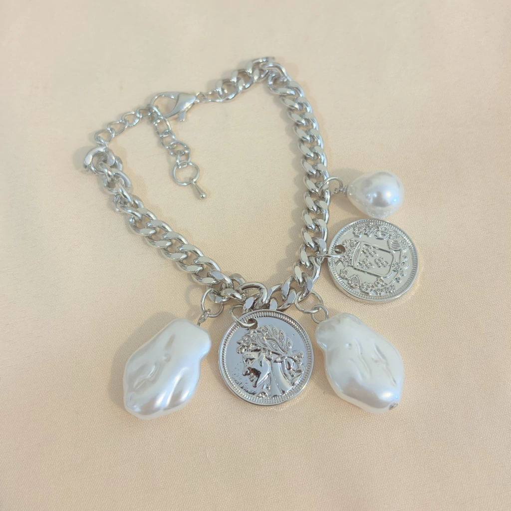 Disponível nas cores prata ou dourado, a pulseira une o toque clássico da pérola com a modernidade das moedas metálicas, formando uma composição elegante e feminina. O banho de bijuteria fina garante brilho duradouro e acabamento delicado, tornando a peça perfeita tanto para o uso diário quanto para complementar looks mais elaborados.