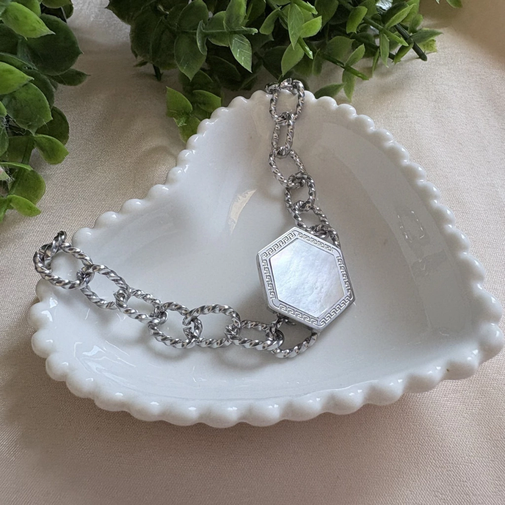 Pulseira Prateada com Enfeite de Madrepérola em Aço Inox